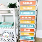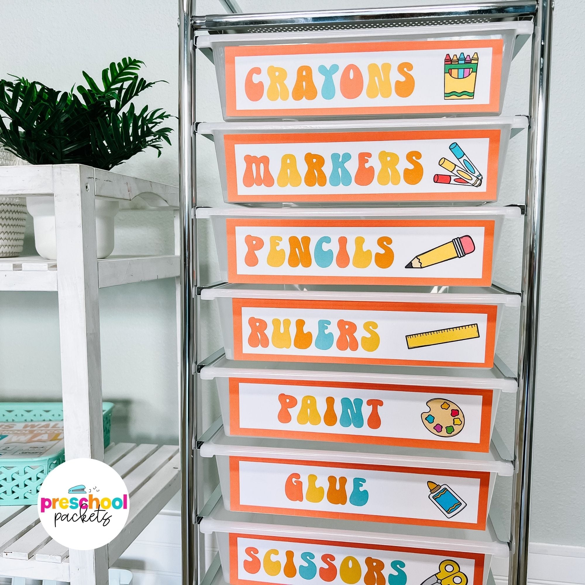 Add a fun and functional flair to your classroom with these Retro Vibes 10 Drawer Cart Labels. The perfect way to keep your teacher cart organized while matching your groovy decor! Whether you're a preschool, PreK, kindergarten, or early elementary teacher, these editable classroom labels are a must-have for a bright and retro-themed setup.