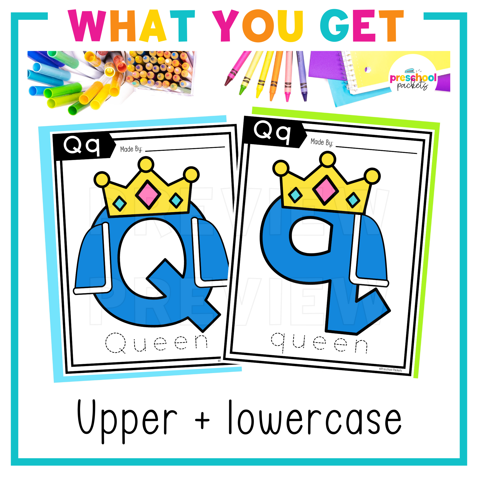 Q is for Queen - a fun way to teach the alphabet to your students! This easy craft is perfect for letter of the week activities in your preschool, preK and Kindergarten classrooms! Choose between uppercase and lowercase alphabet craft options to fit your classroom needs.