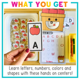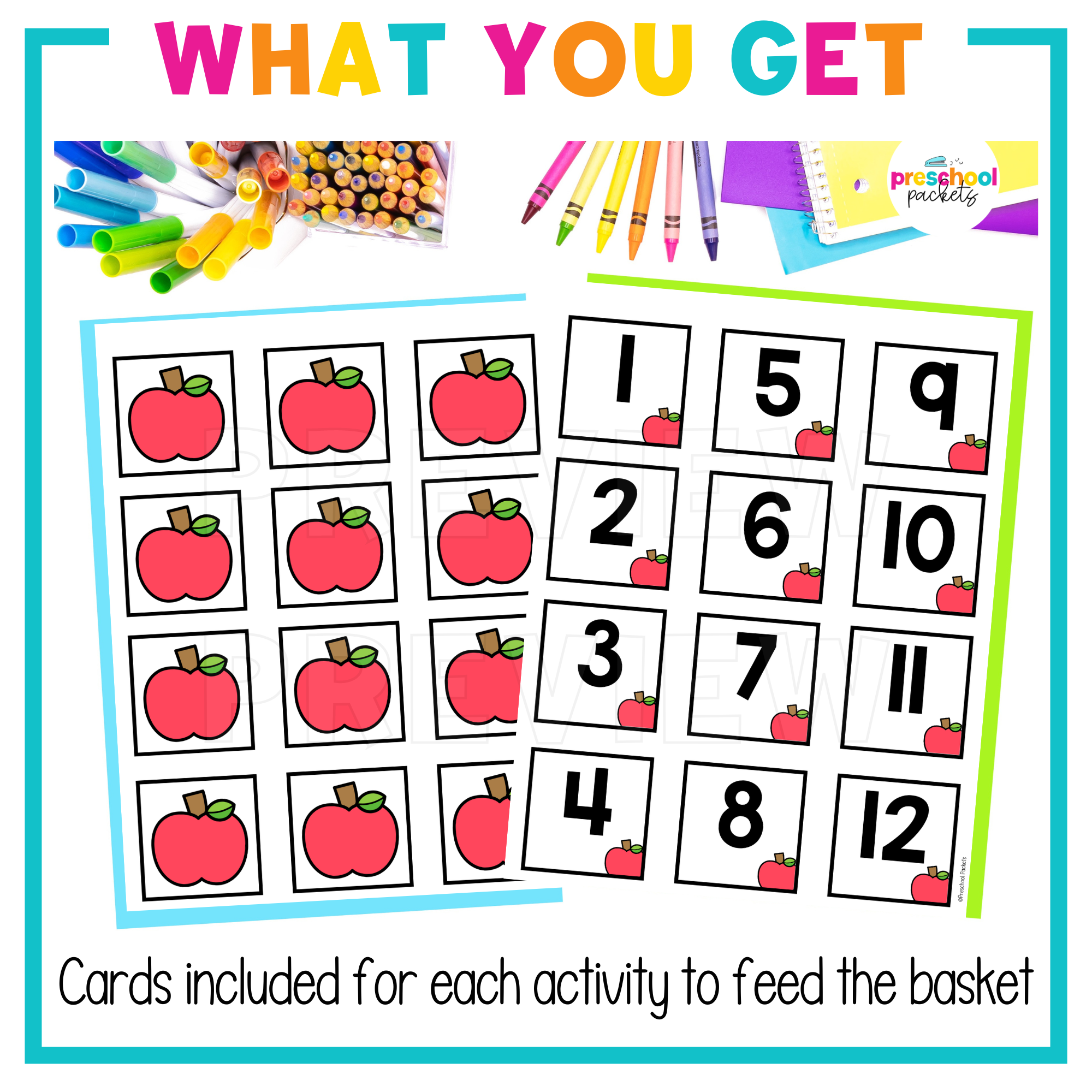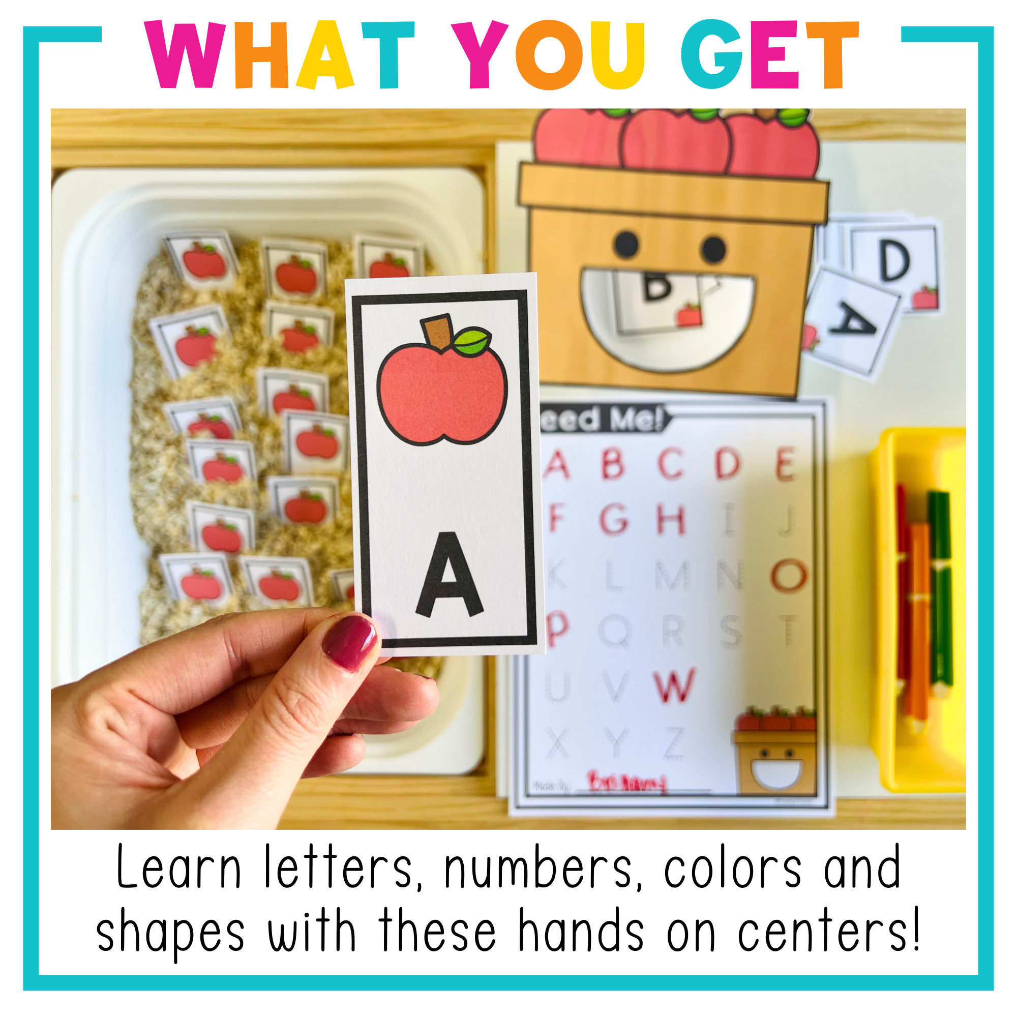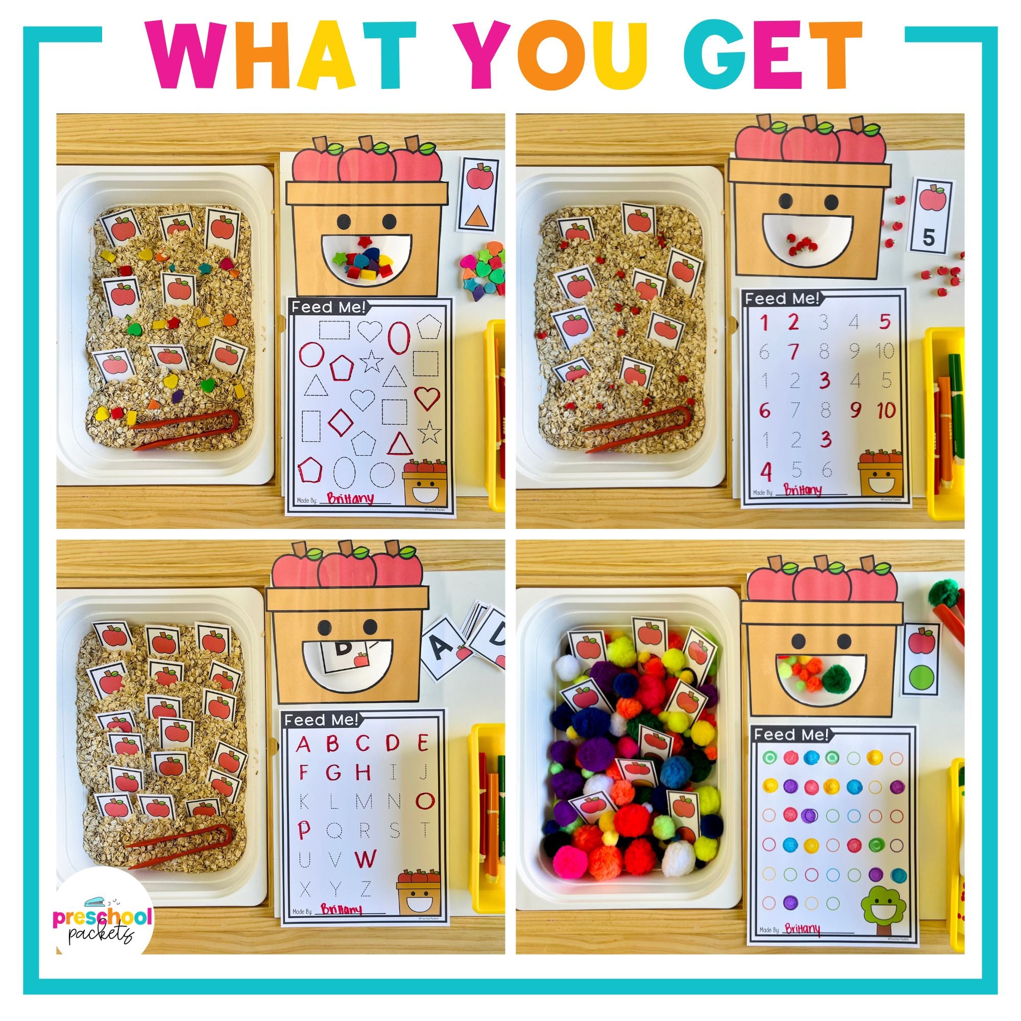 Apple Basket Feed Me Letters, Numbers, Shapes, and Colors centers for Preschool