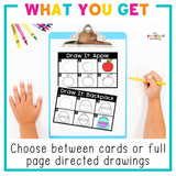 Choose between directed drawing sheets or directed drawing cards and use blank paper to fit your classroom needs.