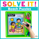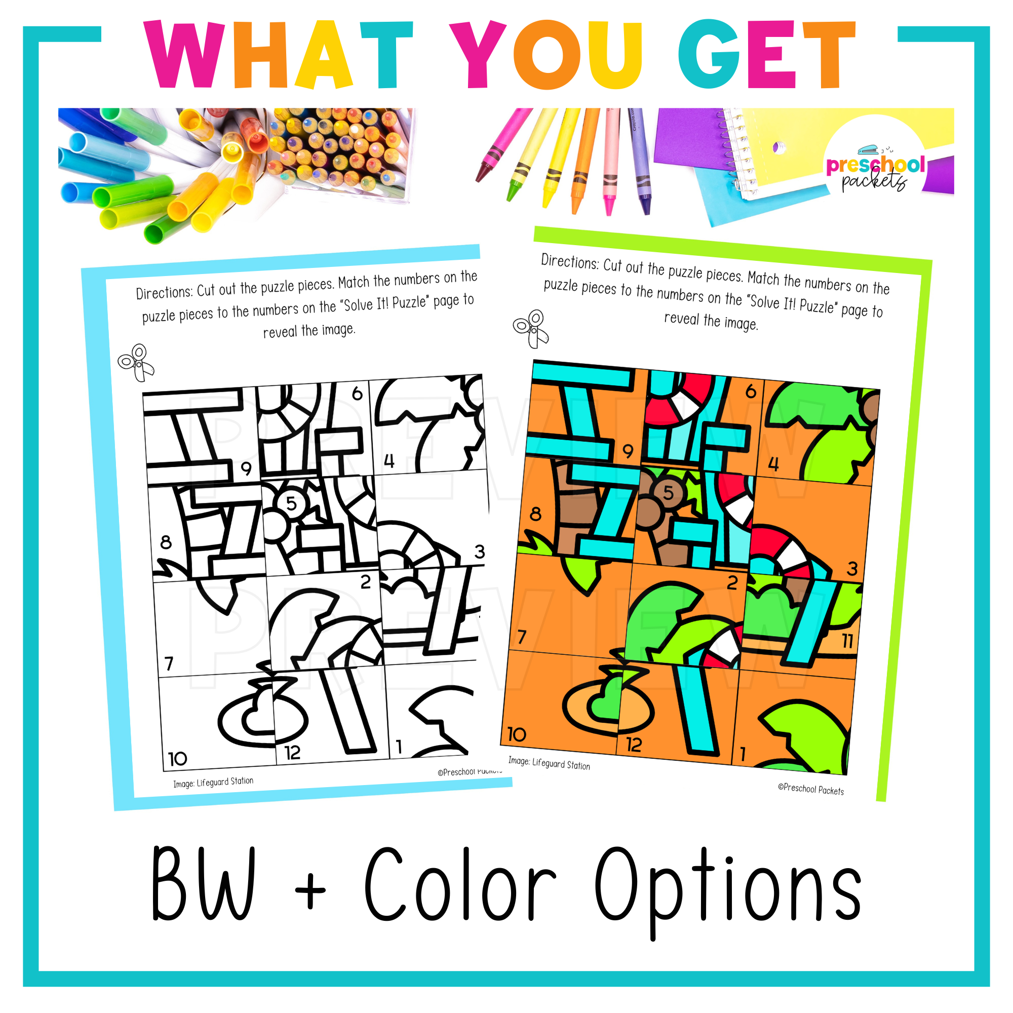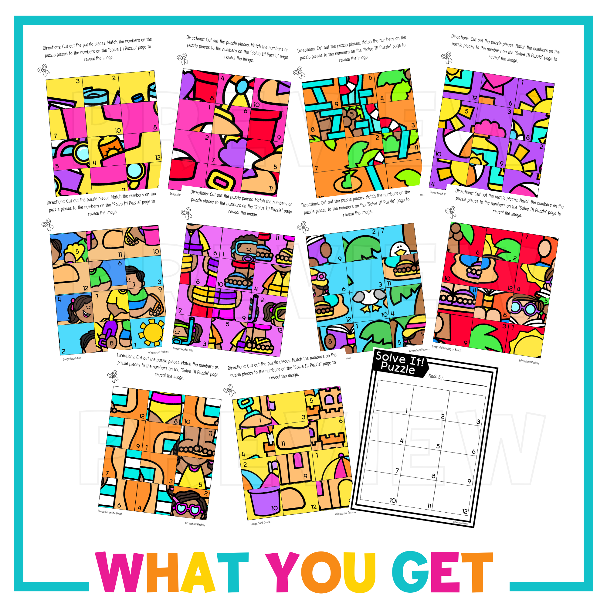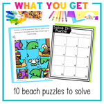 ⭐ 10 Beach Solve It! Puzzles - BW and color options are provided for each puzzle.