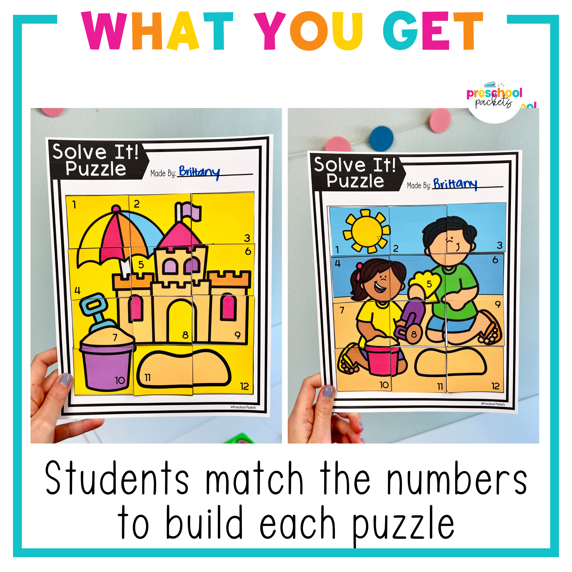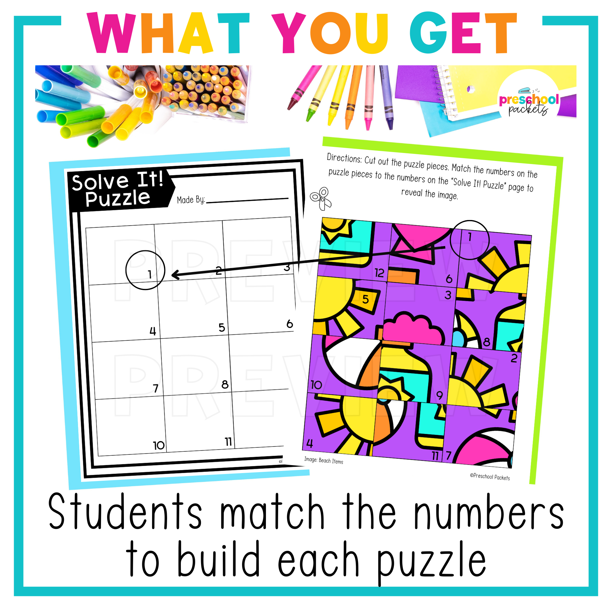 Students can work on fine motor skills by cutting and pasting each puzzle piece, or you can laminate them for repeated use! Plus work on math skills by matching each number to build the puzzle.
