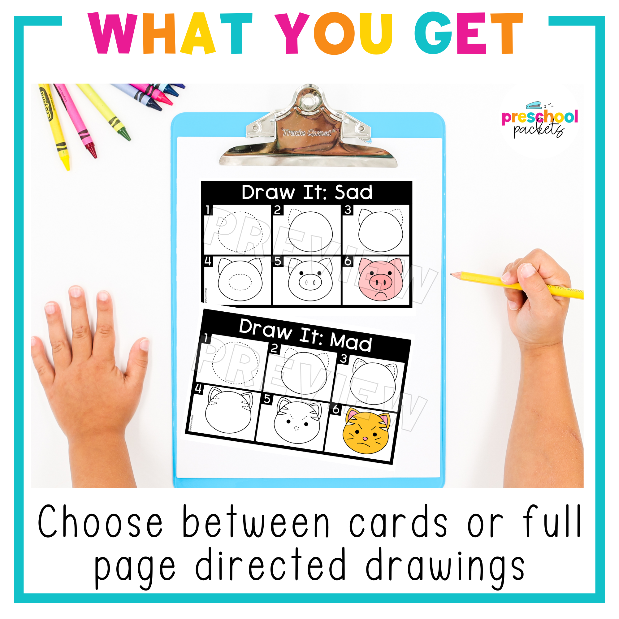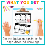 Choose between directed drawing sheets or directed drawing cards and use blank paper to fit your classroom needs.