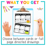 Choose between directed drawing sheets or directed drawing cards and use blank paper to fit your classroom needs.