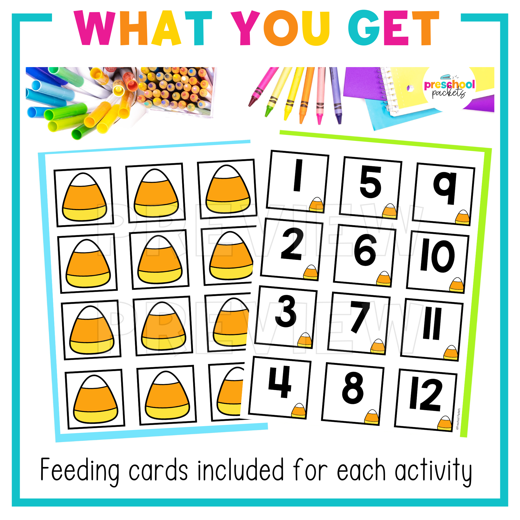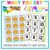 Students love "feeding" Frankenstein candy corn while practicing letters, numbers, shapes, and colors. This interactive activity helps to build early literacy and math foundations while also developing fine motor coordination.