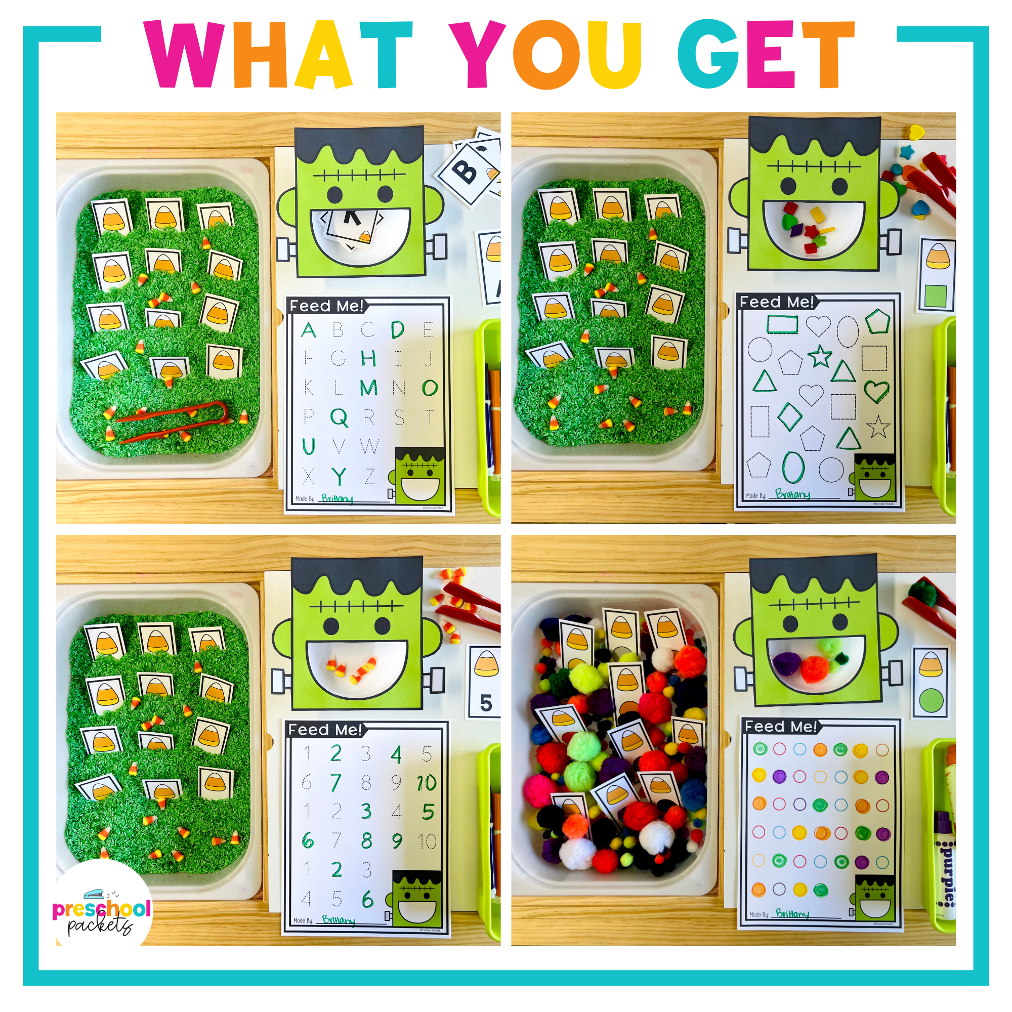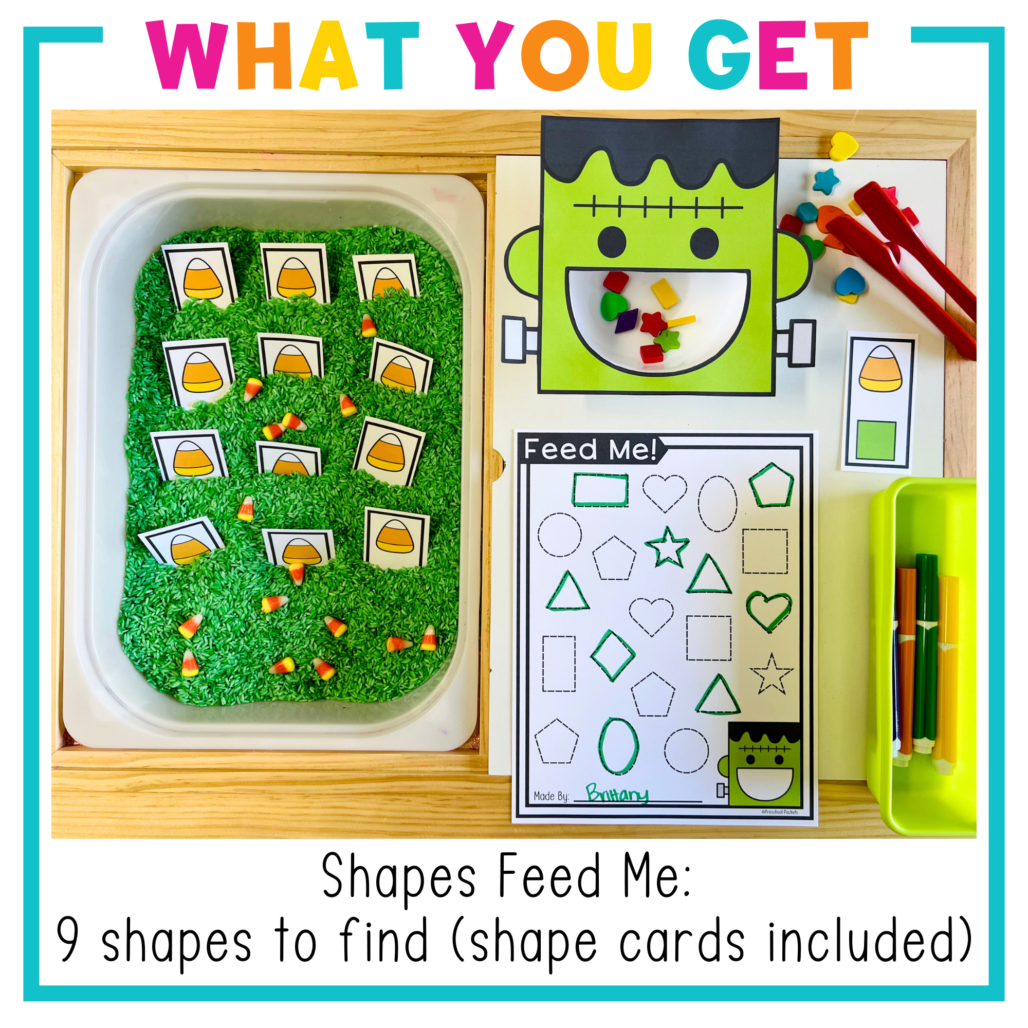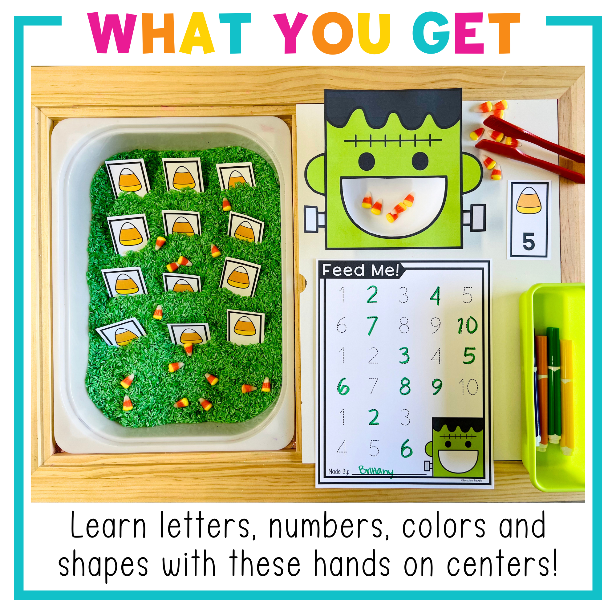 Feed Me! Halloween Frankenstein - Looking for fun, hands-on Halloween activities for your preschool classroom? These Feed Me! Frankenstein centers are ideal for practicing letters, numbers, shapes, and colors.