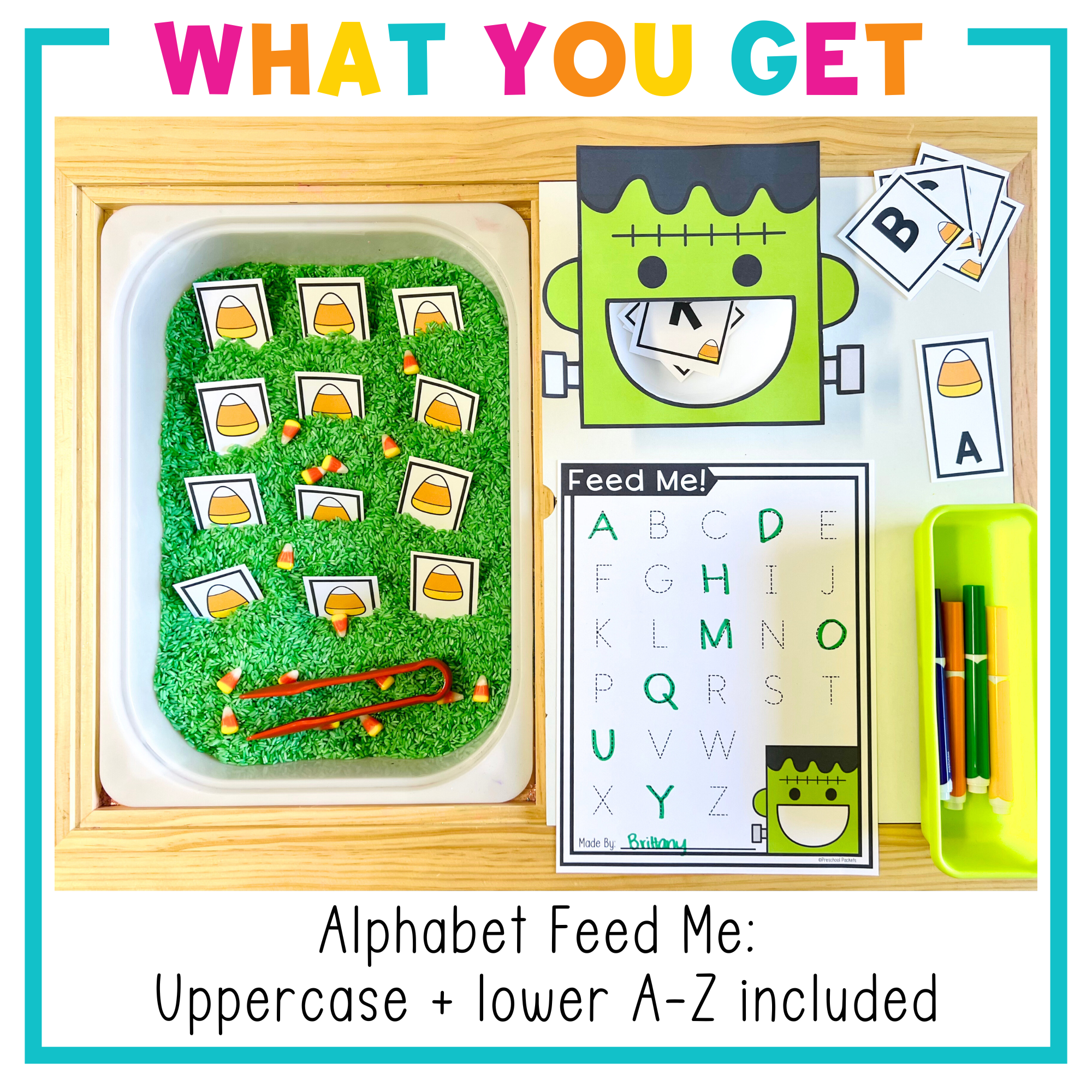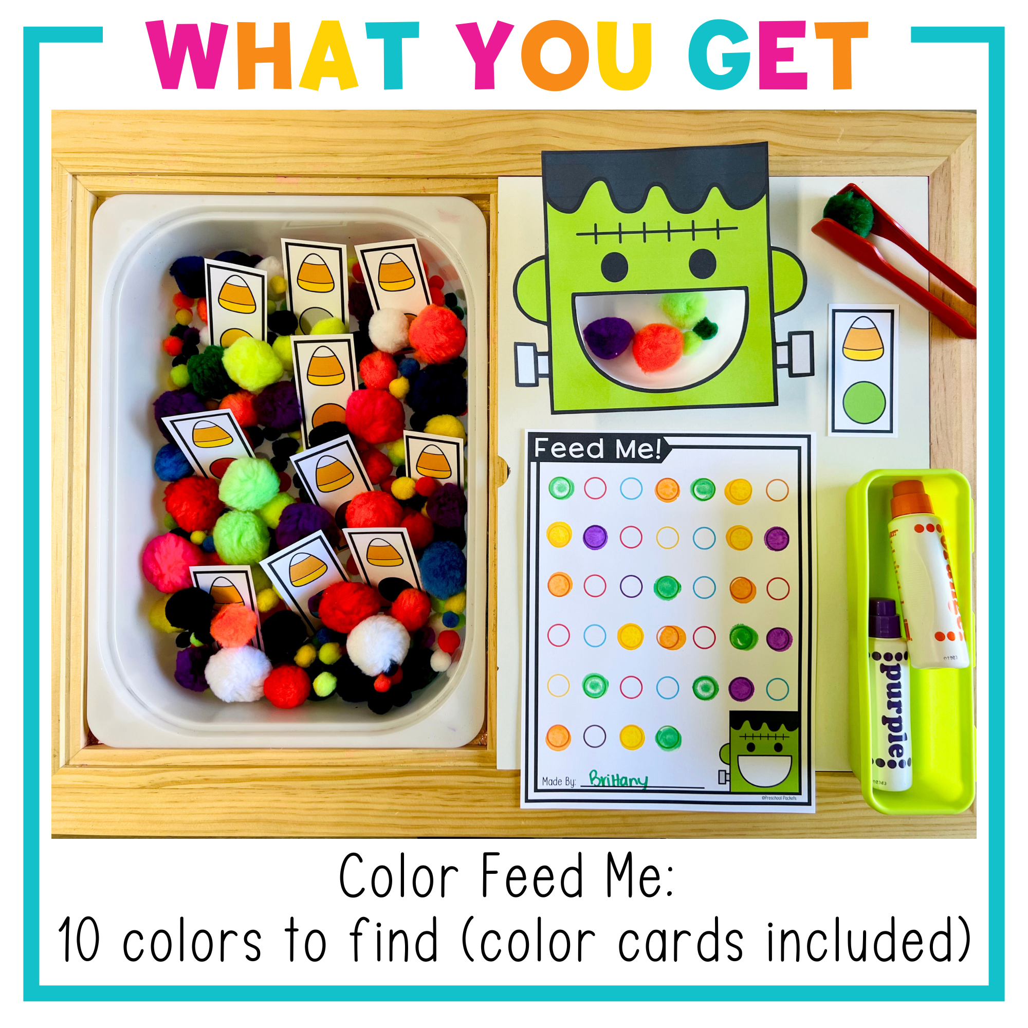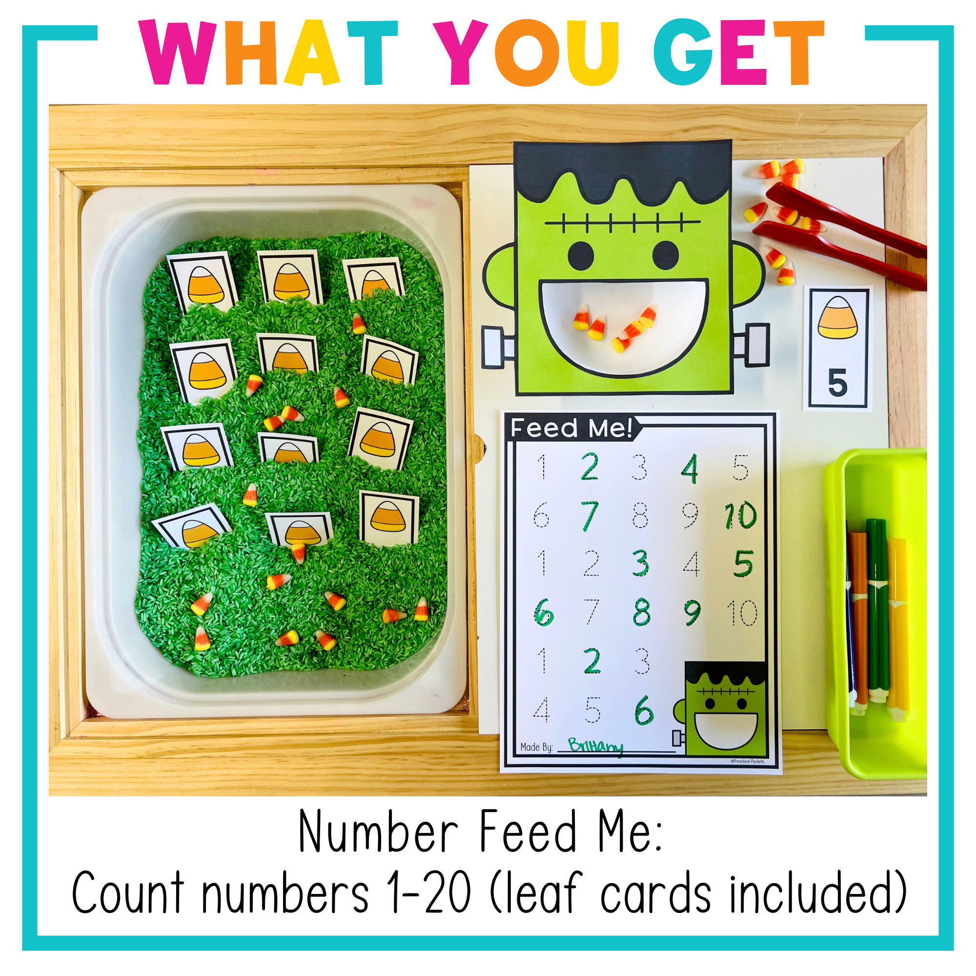Feed Me! Halloween Frankenstein - Looking for fun, hands-on Halloween activities for your preschool classroom? These Feed Me! Frankenstein centers are ideal for practicing letters, numbers, shapes, and colors.