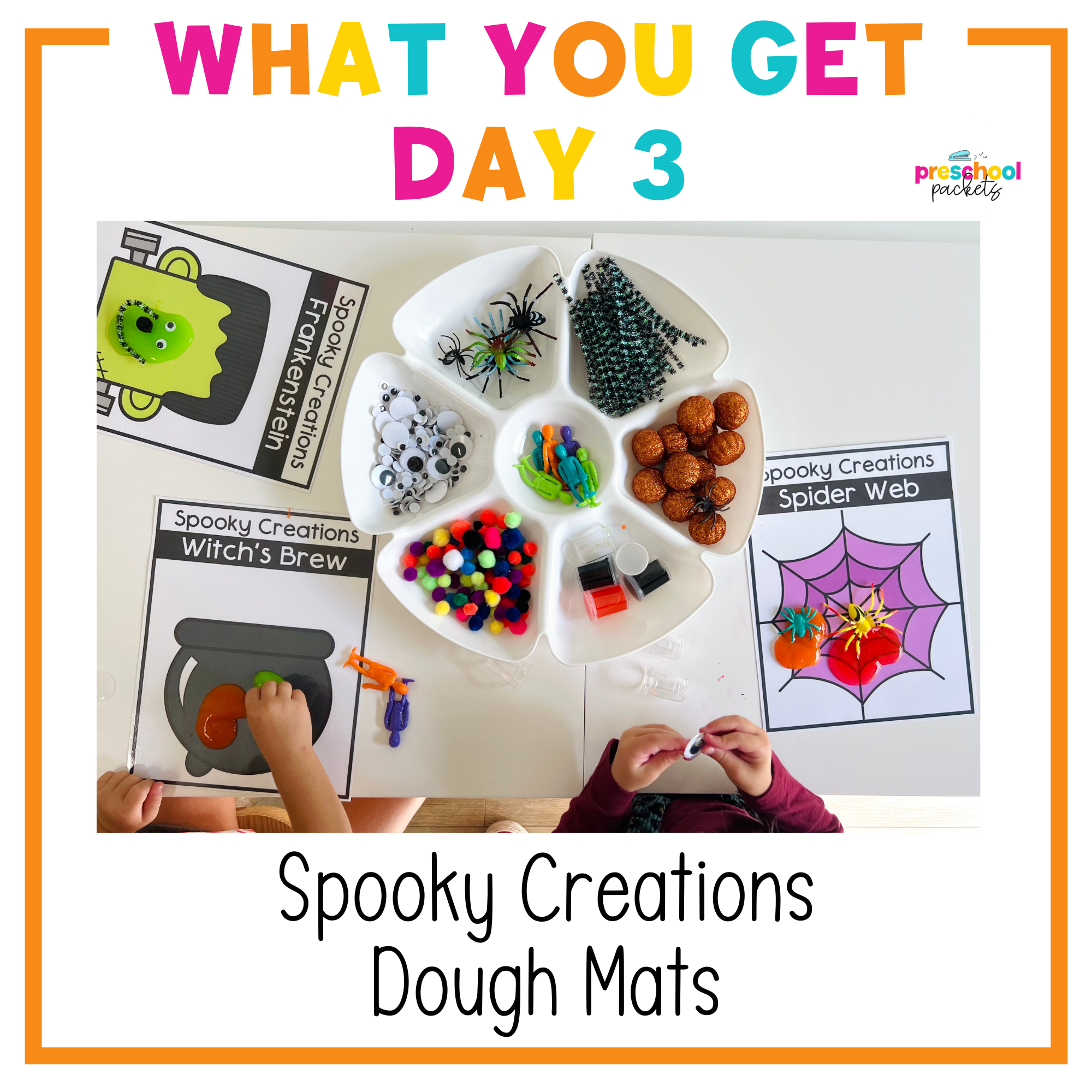- Spooky Creations: These are open ended play dough (or use slime!) mats. Students can decorate these Halloween themed mats: Frankenstein, spider web, witch, witch's brew, haunted house, Jack O Lantern
