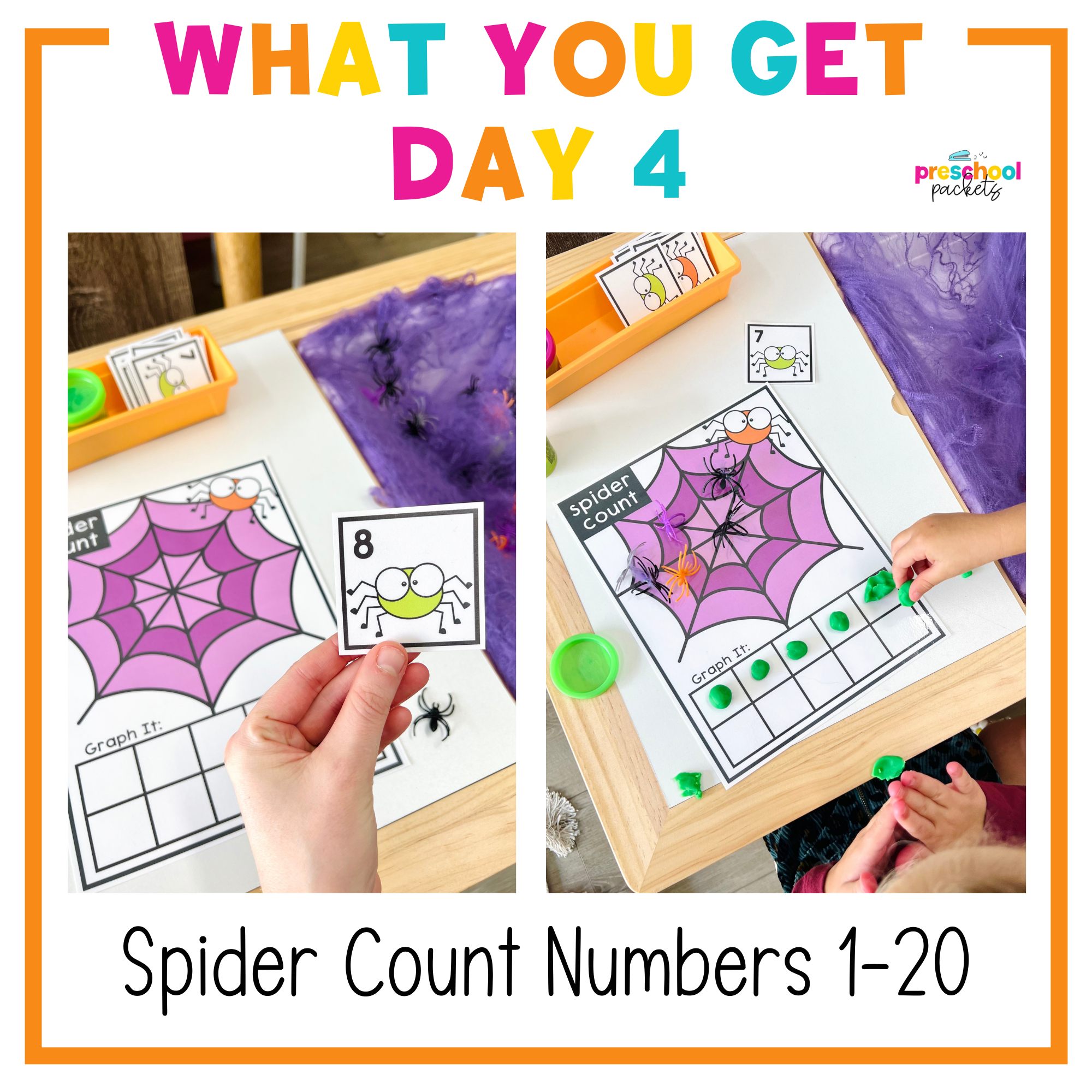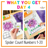 - Spider Count: Set up a spider sensory bin by adding webs from the Dollar Store! Students can count spiders and graph the number on the mat. Two mats included: counting from 1-10 and counting from 1-20.