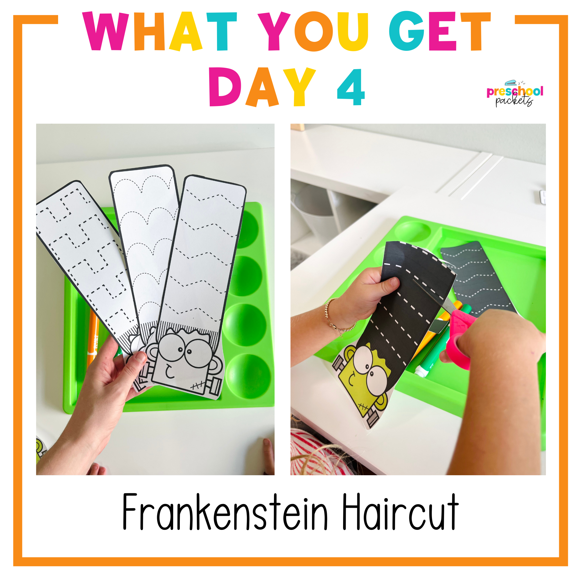 - Frankenstein Haircut: Students can work on scissor skills by cutting the lines on Frankenstein's hair! 10 Cutting cards included. (BW and Color options provided)