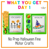- Fine Motor Crafts: Paper tear crafts - witches hat, ghost, bat, candy corn, pumpkin. Cut and Paste Crafts: Haunted house, Spider Web, Little Pumpkins (BW crafts only)