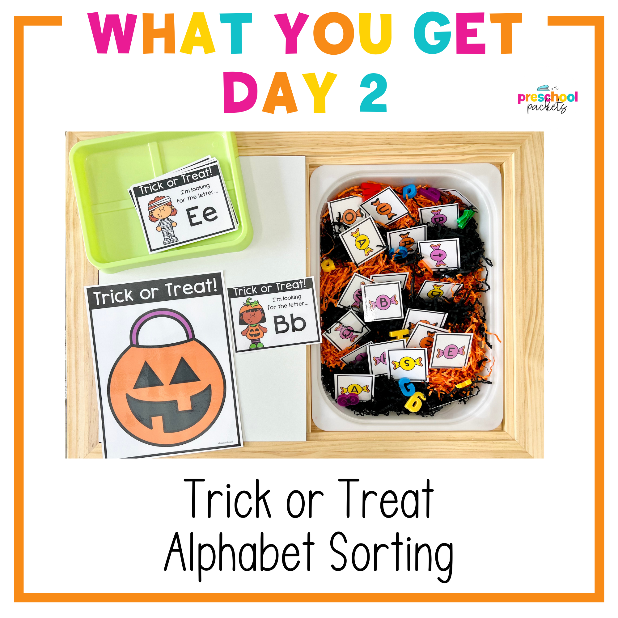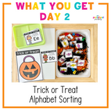 - Trick or Treat: Students can work on letter recognition by finding the correct letters to add to the the trick or treat mat! This is easy to set up as a sensory bin! Letters A-Z included.
