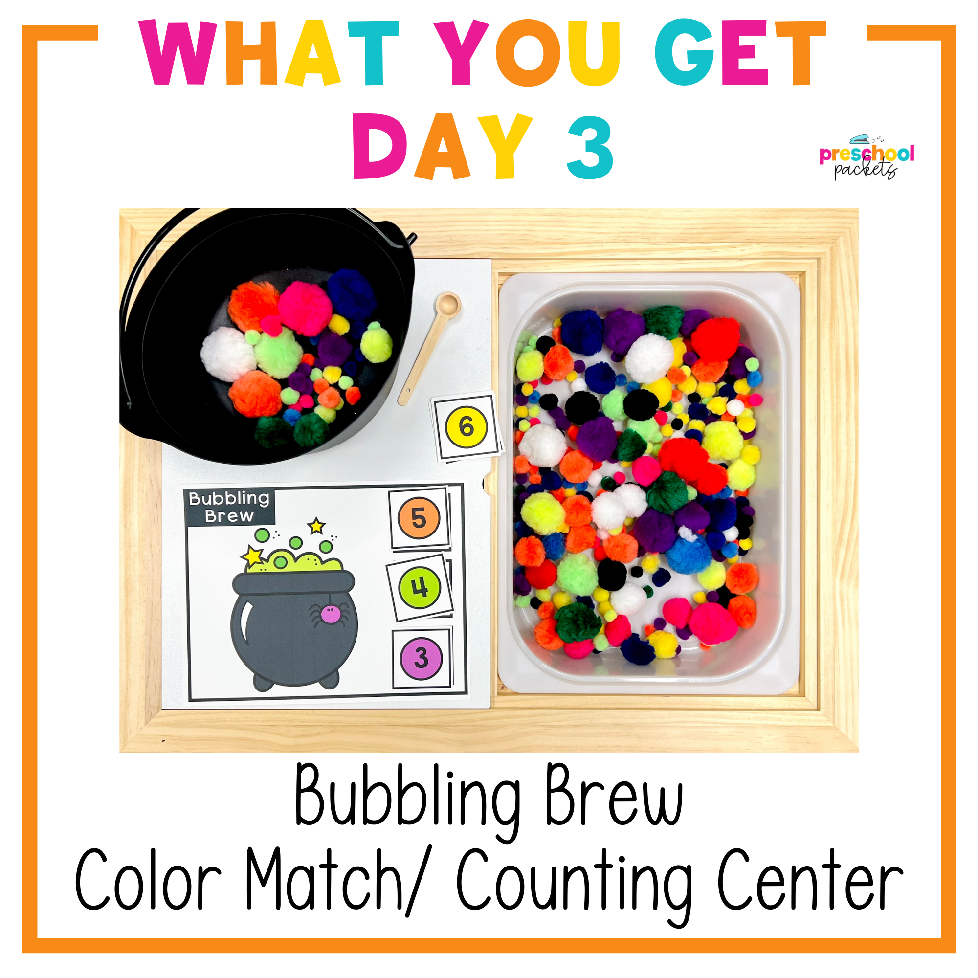 - Bubbling Brew: Set up a bubbling brew sensory bin with rainbow pom poms! Students can sort colors and work on counting with this adorable Halloween center! Numbers 1-20 included. Colors: red, orange, yellow, green, blue, pink, purple, brown, black