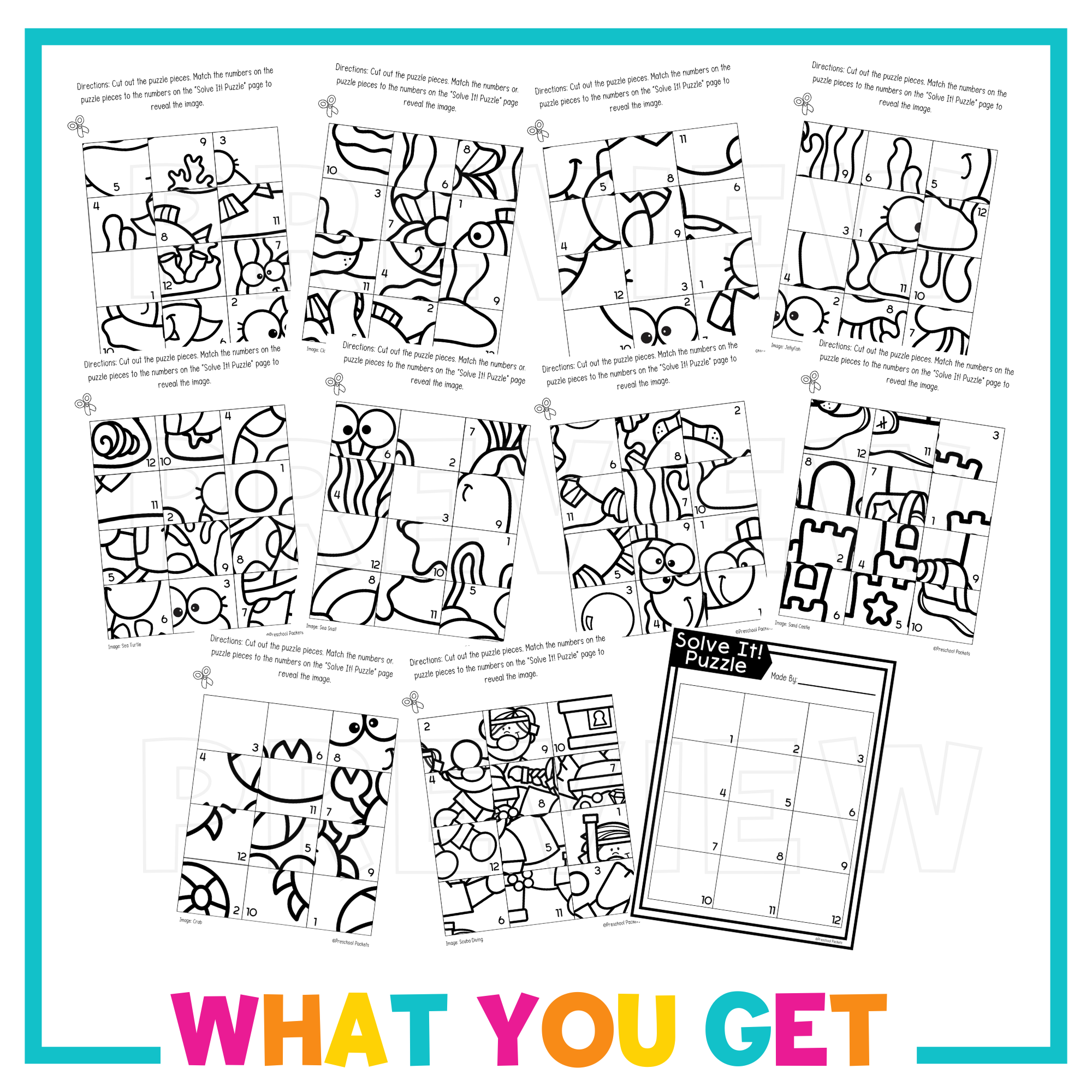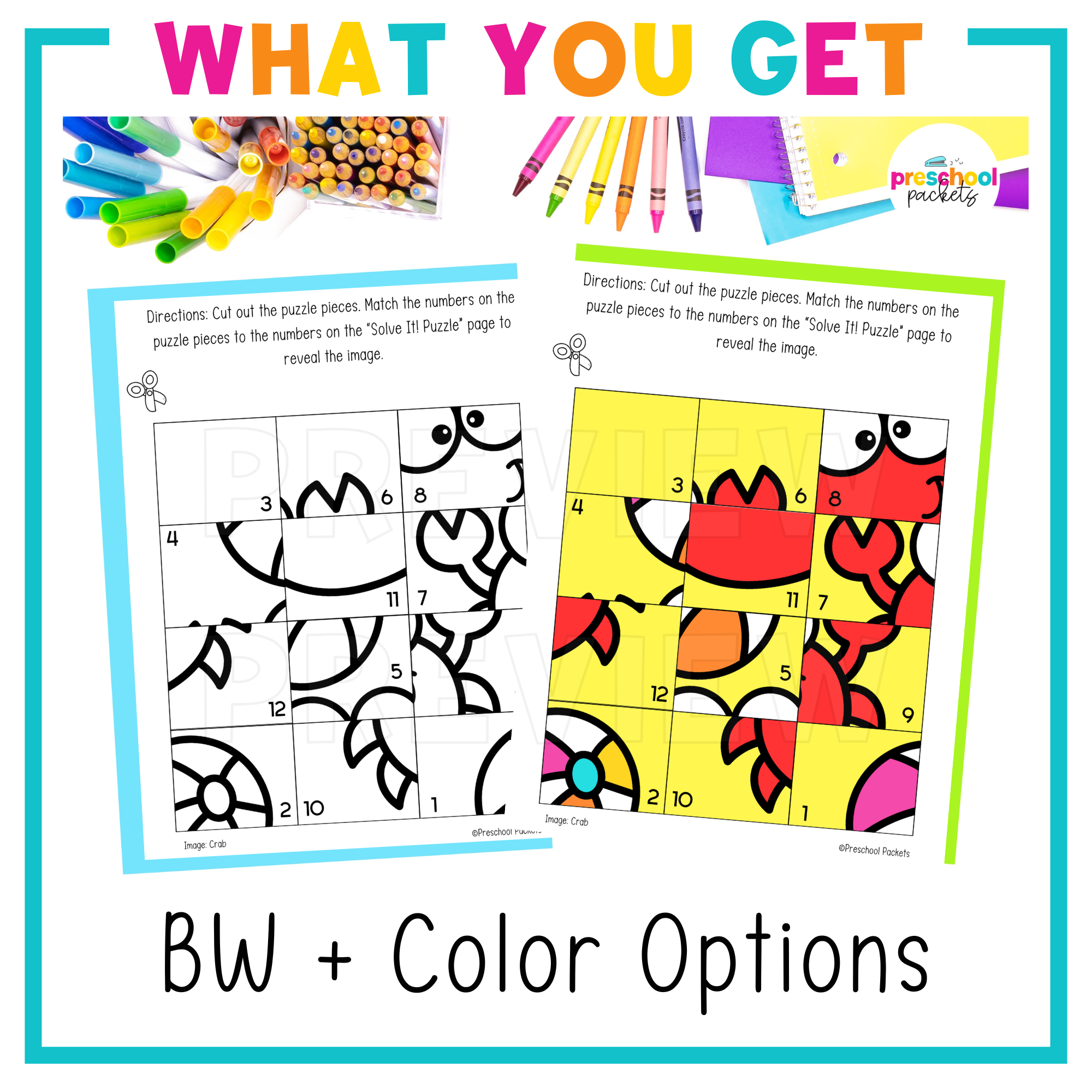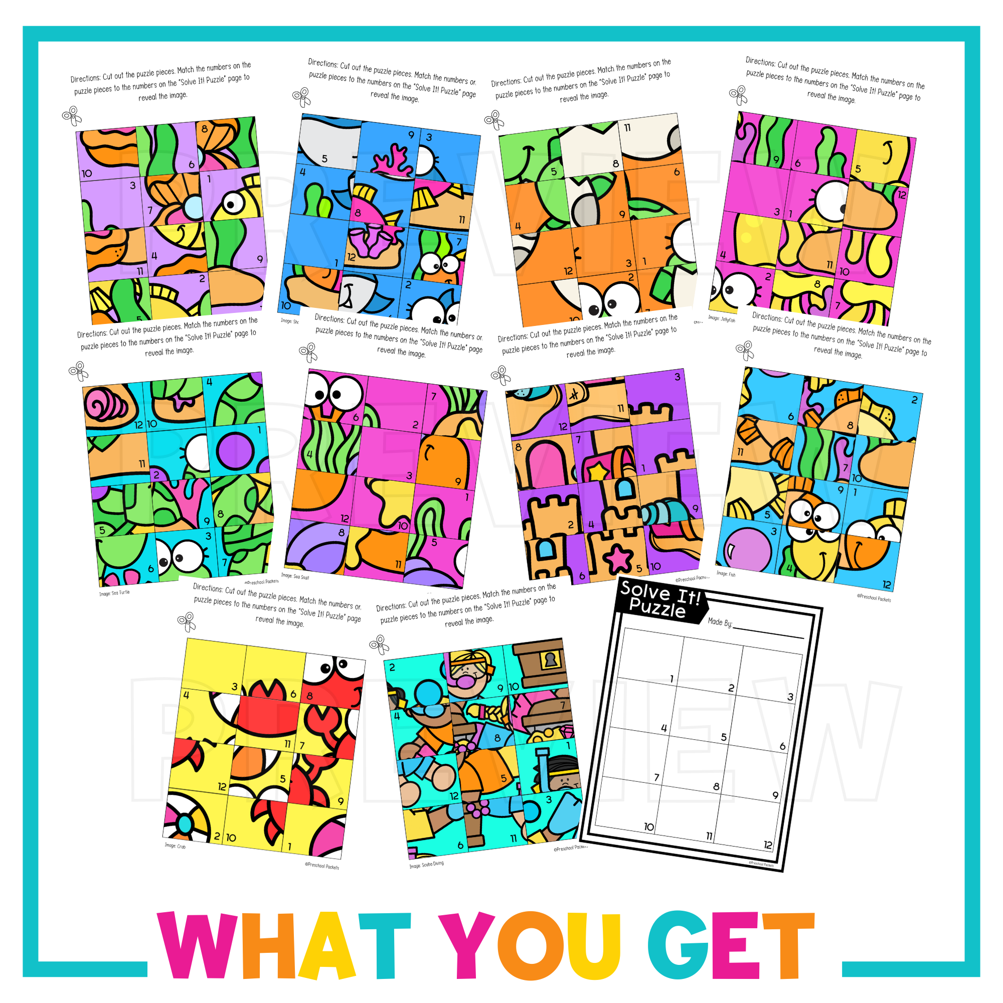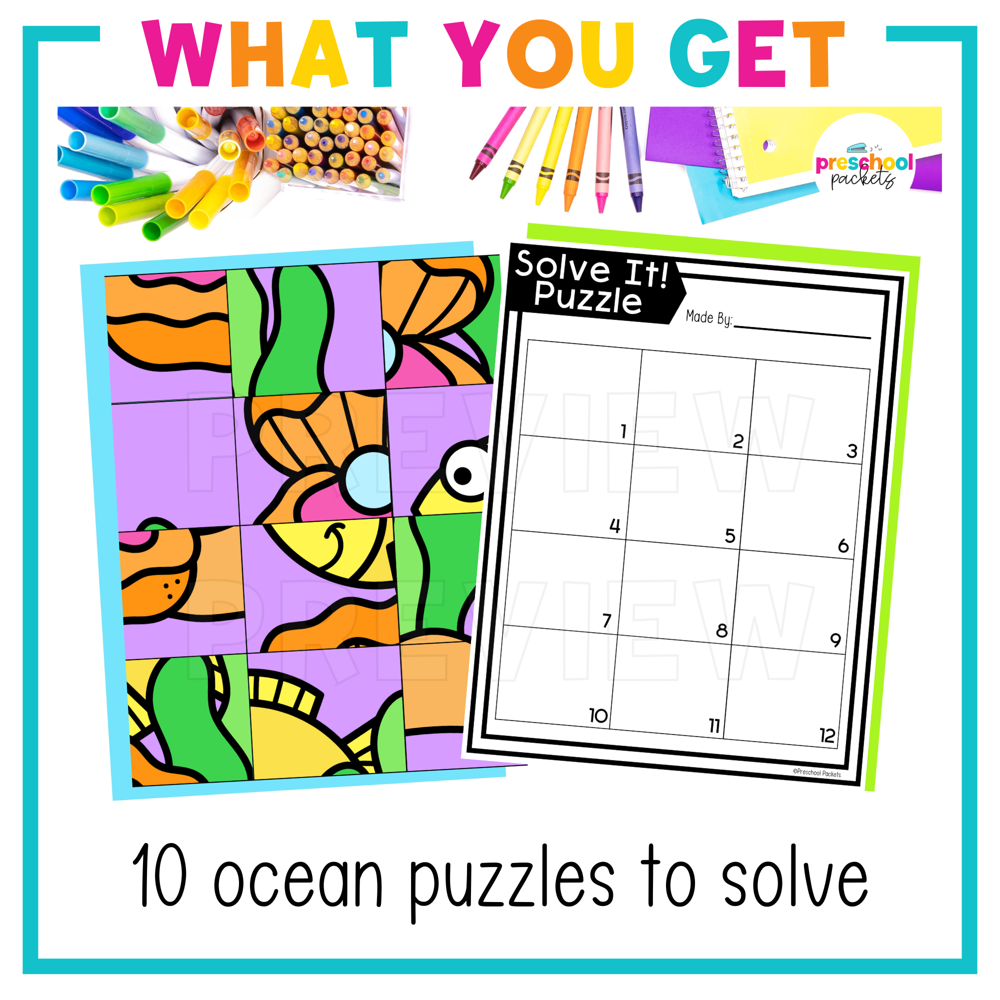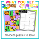 ⭐ 10 Ocean Solve It! Puzzles - BW and color options are provided for each puzzle.