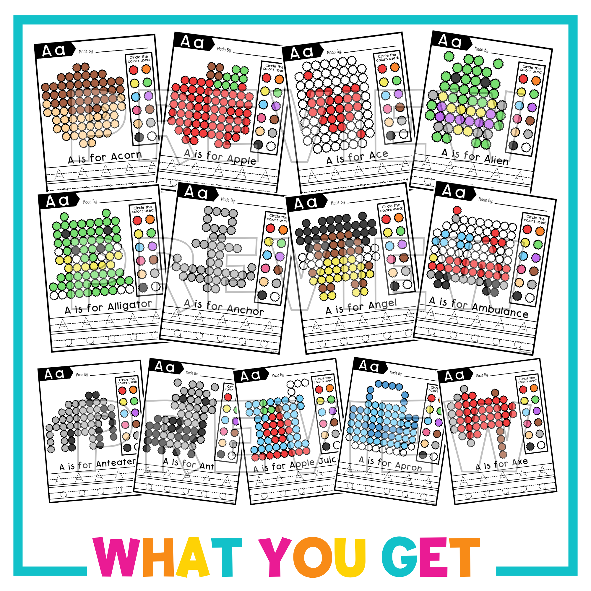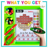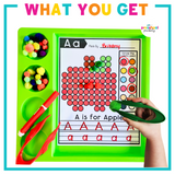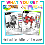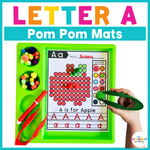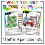 This set includes 13 different Letter A-themed pom pom mats, perfect for Letter of the Week activities, literacy centers, or morning work.