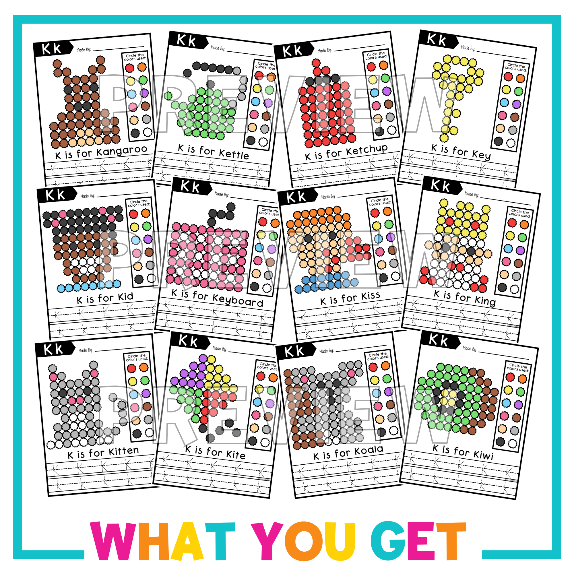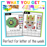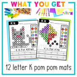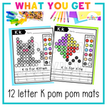 This set includes 12 different Letter K-themed pom pom mats, perfect for Letter of the Week activities, literacy centers, or morning work.