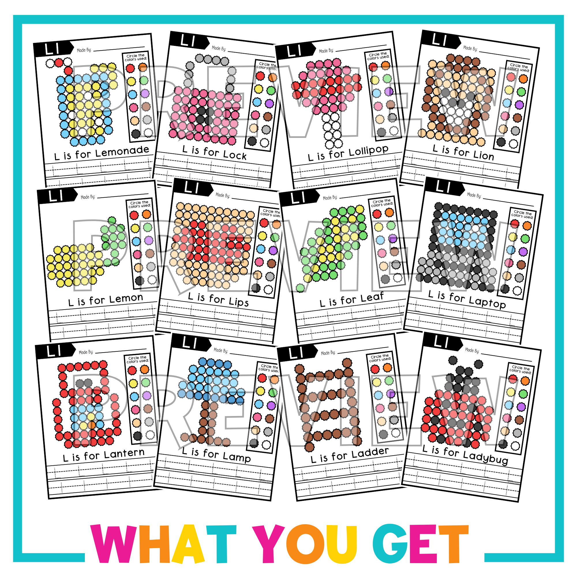 This set includes 12 different Letter L-themed pom pom mats, perfect for Letter of the Week activities, literacy centers, or morning work.