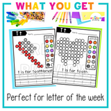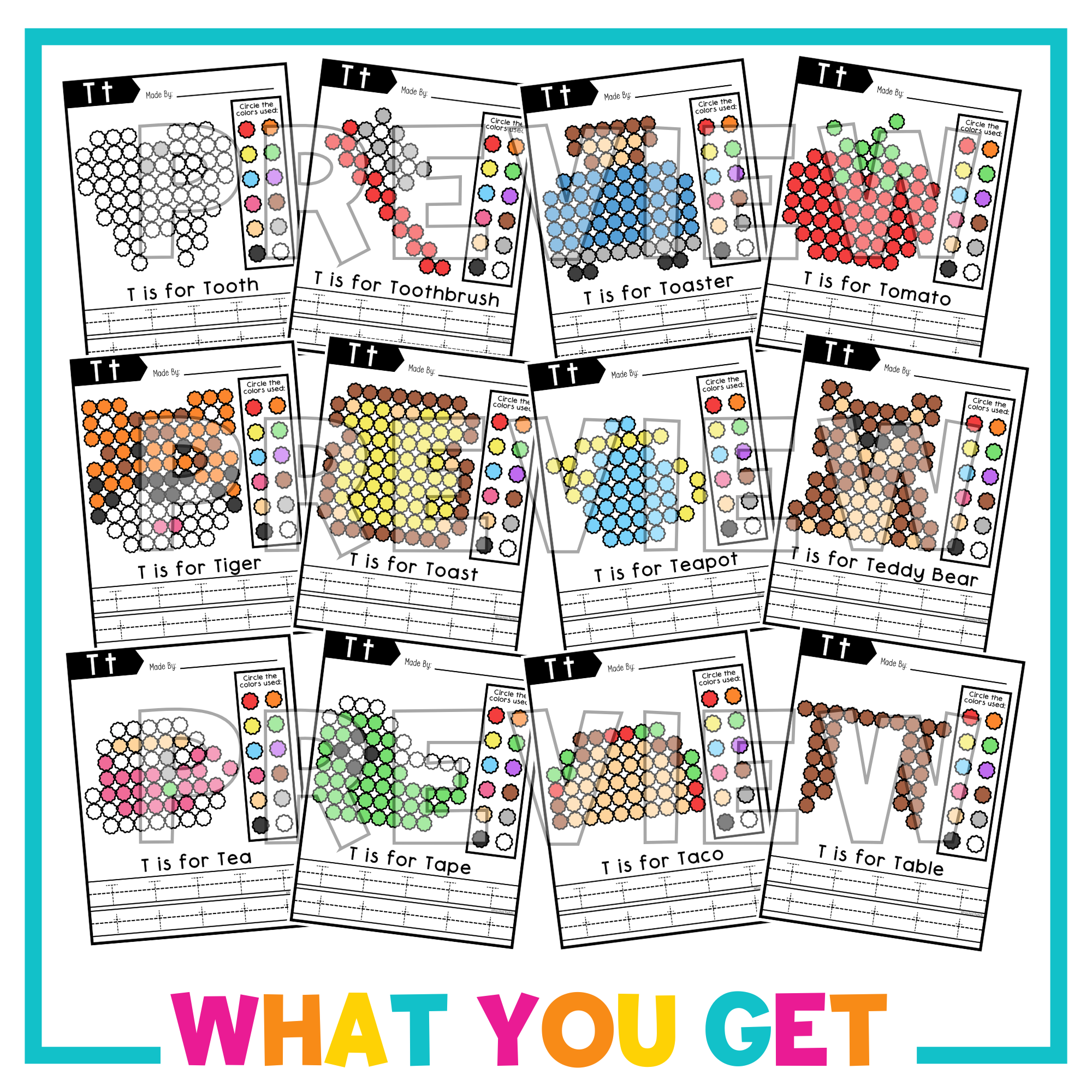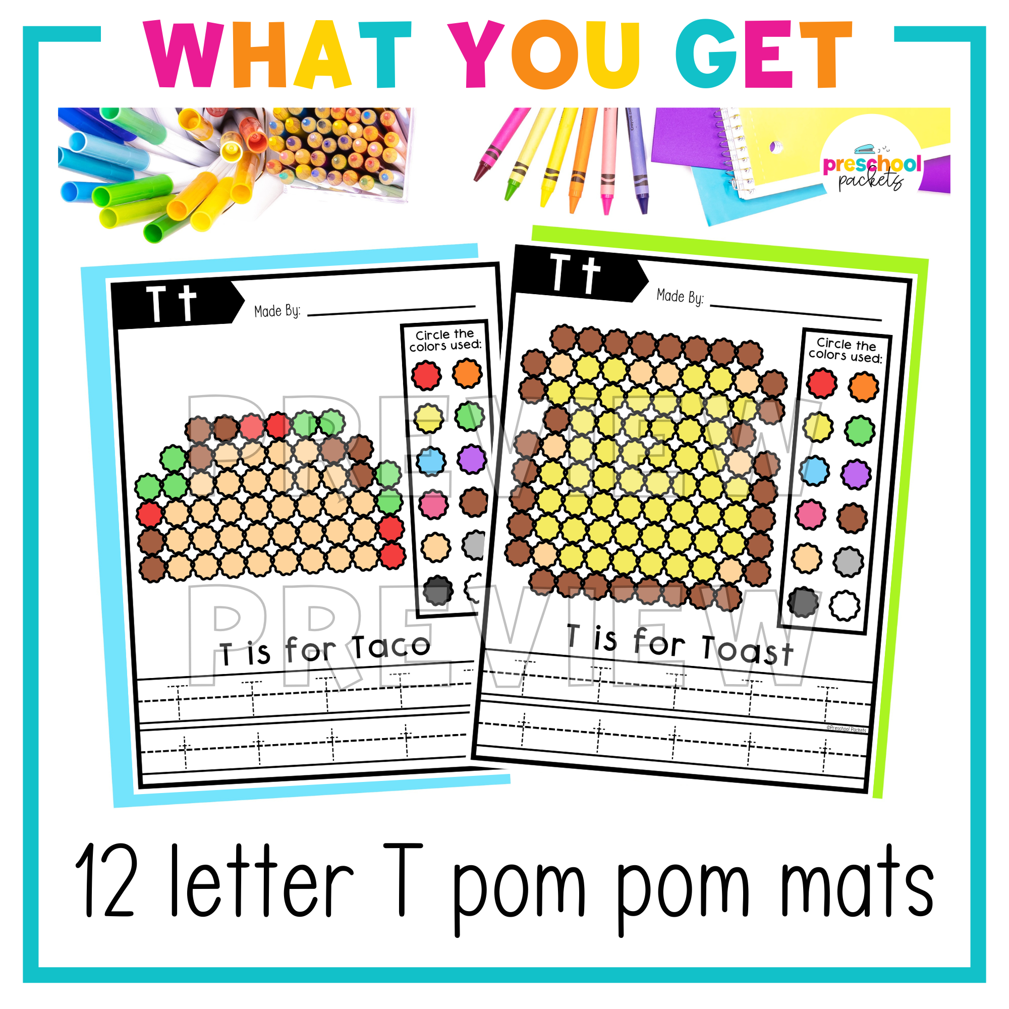 This set includes 12 different Letter T-themed pom pom mats, perfect for Letter of the Week activities, literacy centers, or morning work.