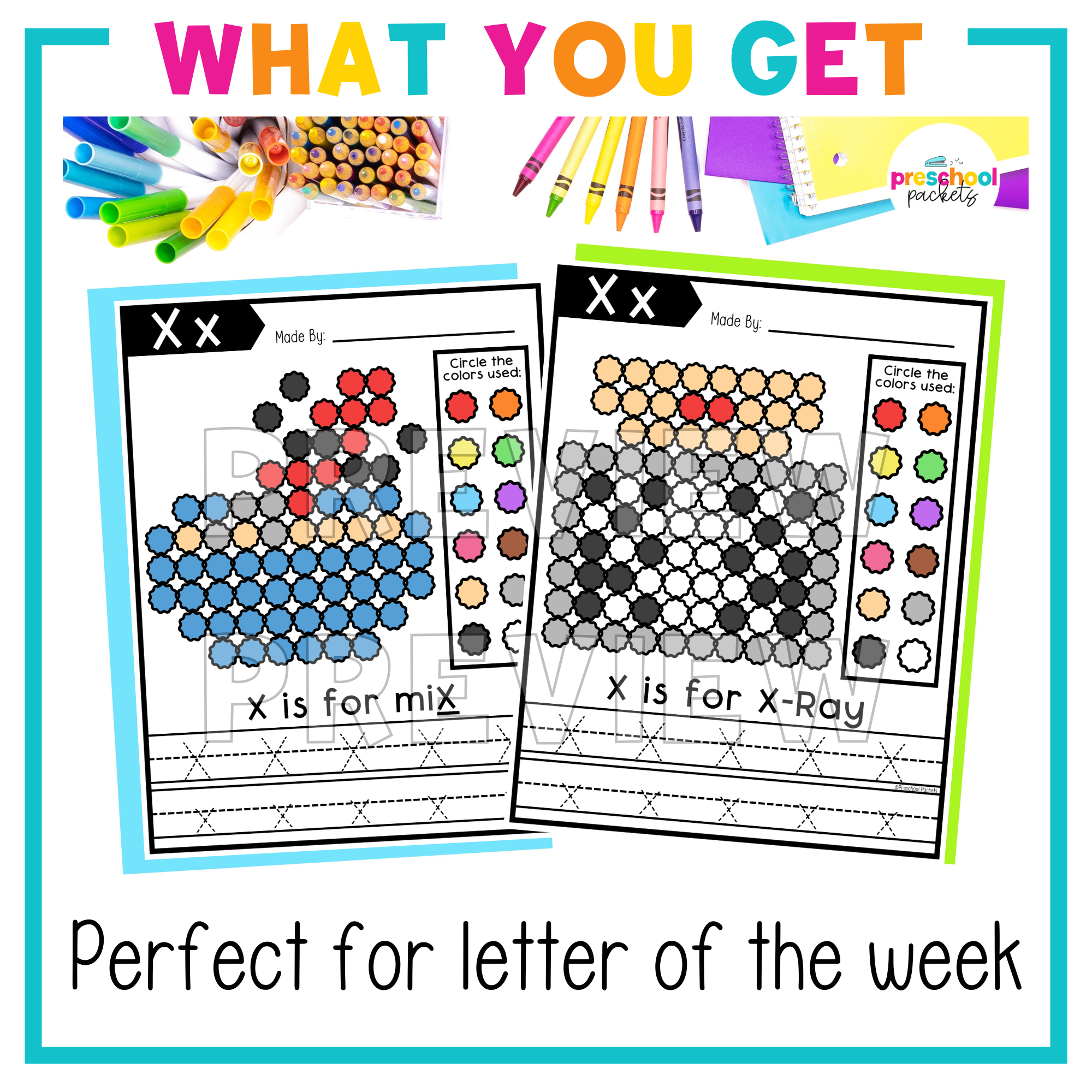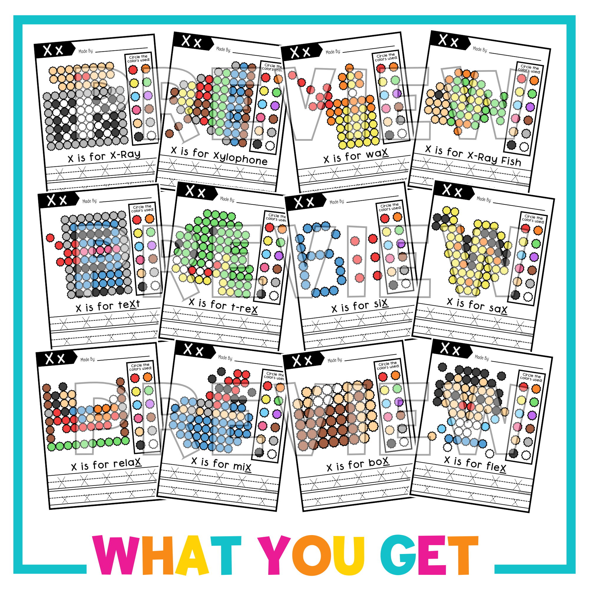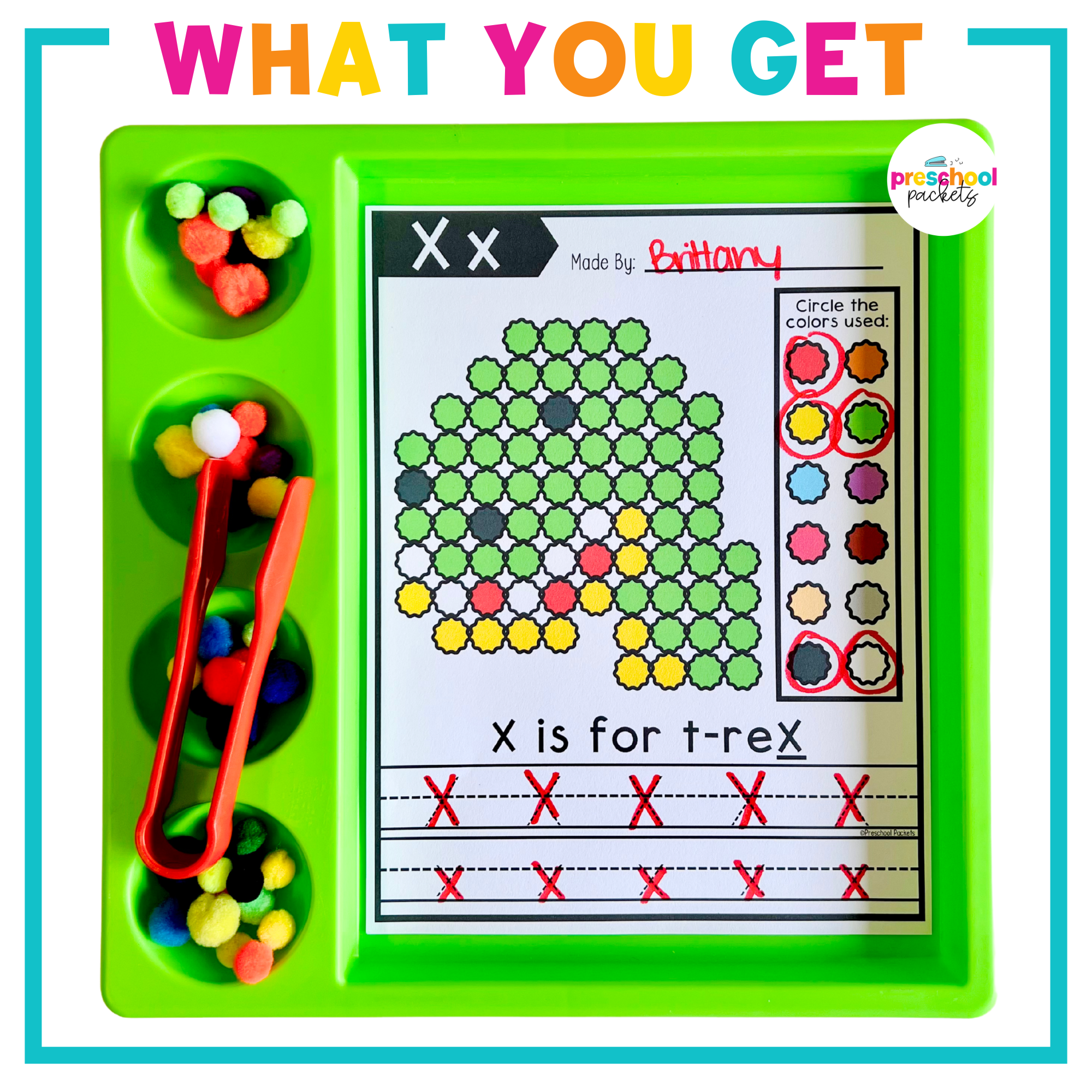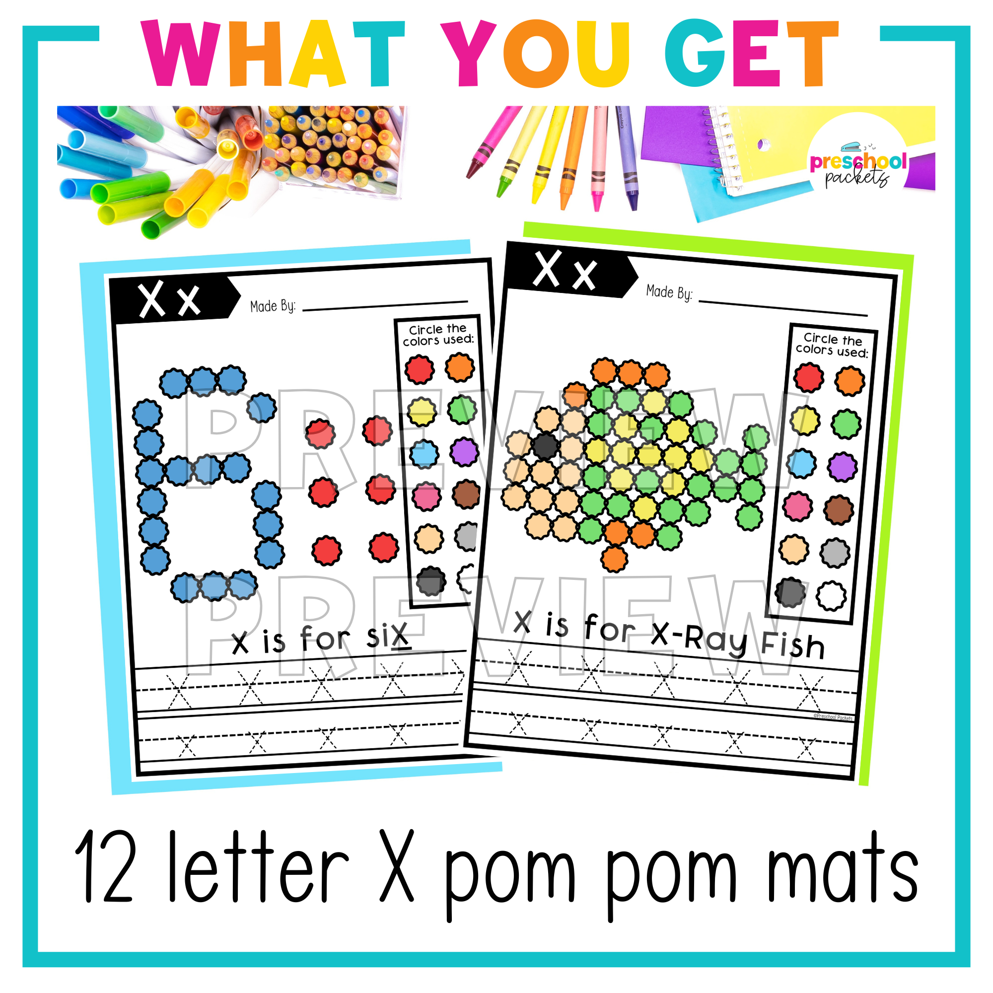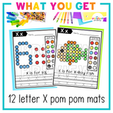 This set includes 12 different Letter X-themed pom pom mats, perfect for Letter of the Week activities, literacy centers, or morning work.
