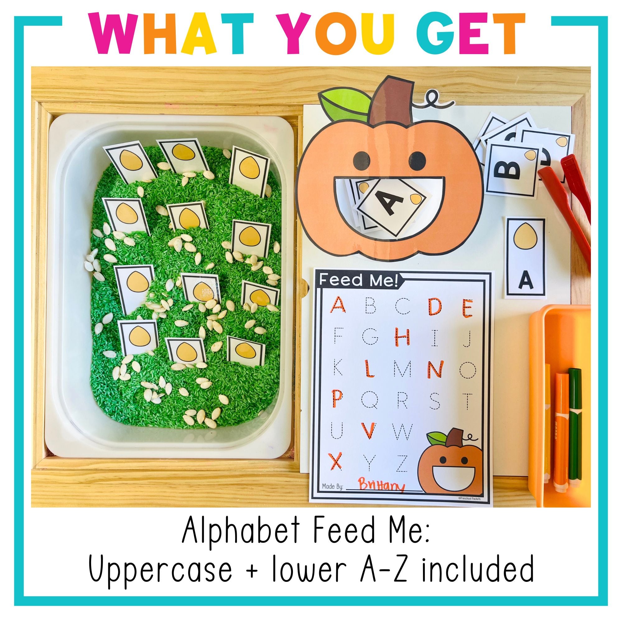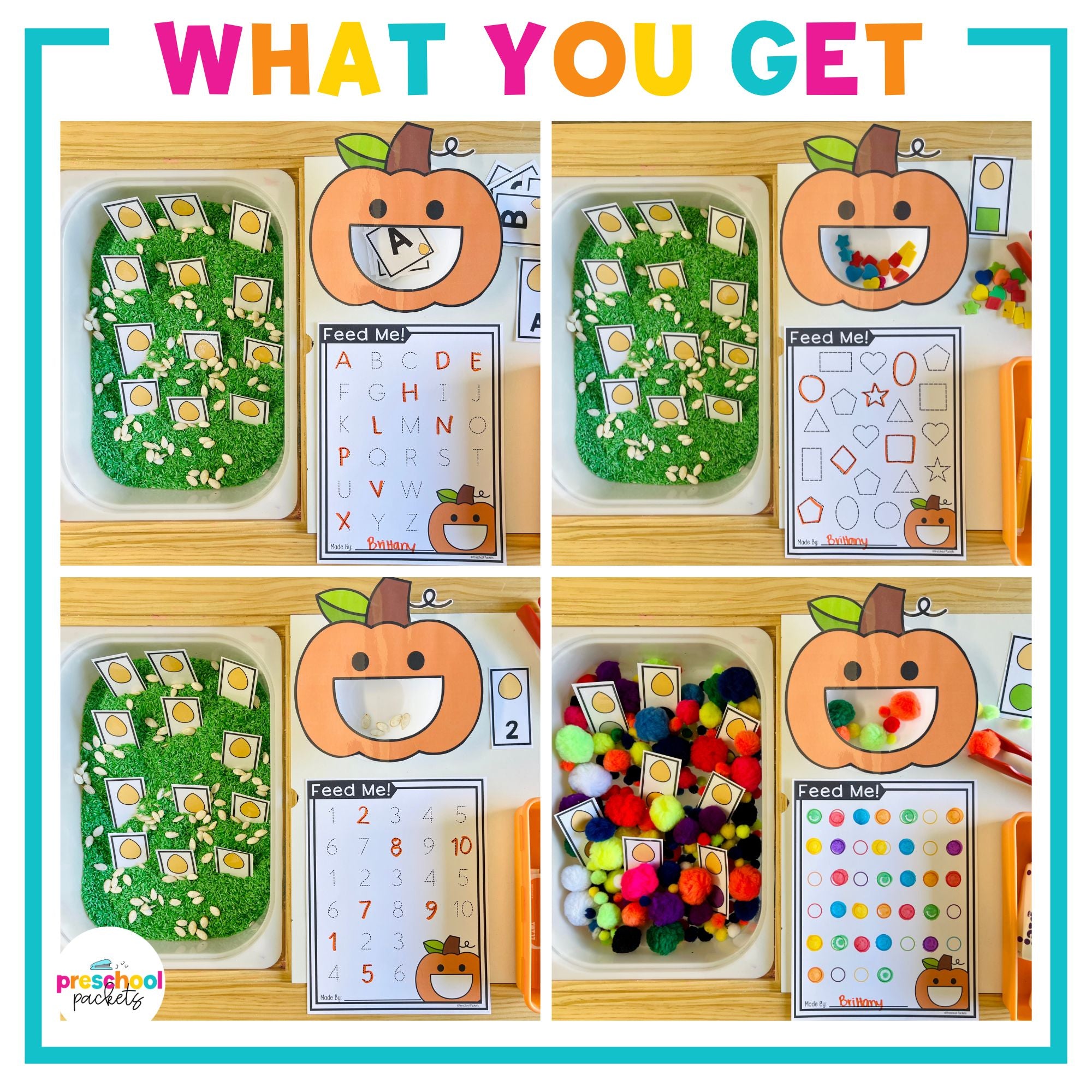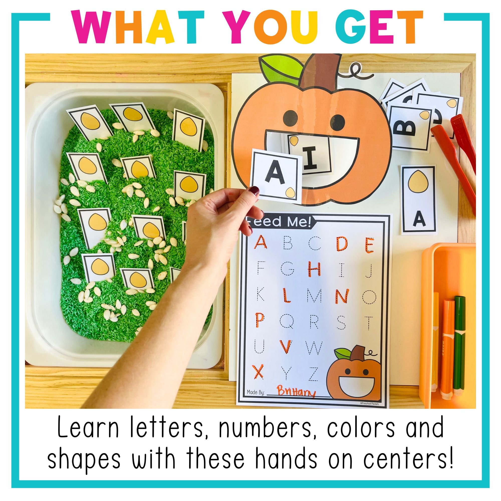 Pumpkin Feed Me Letters, Numbers, Shapes, and Colors Fall Centers for Preschool