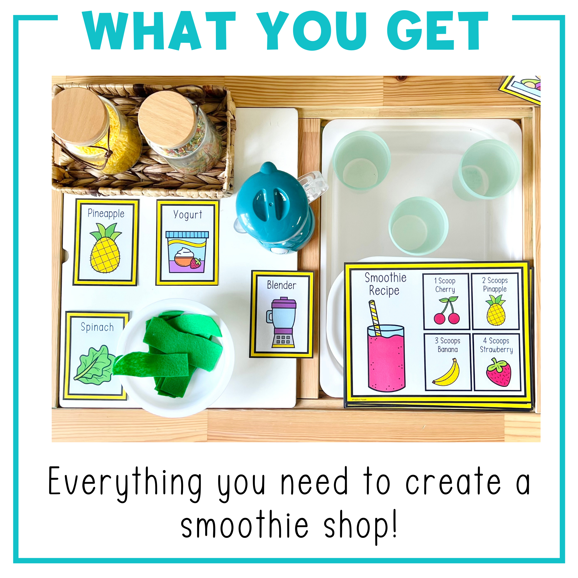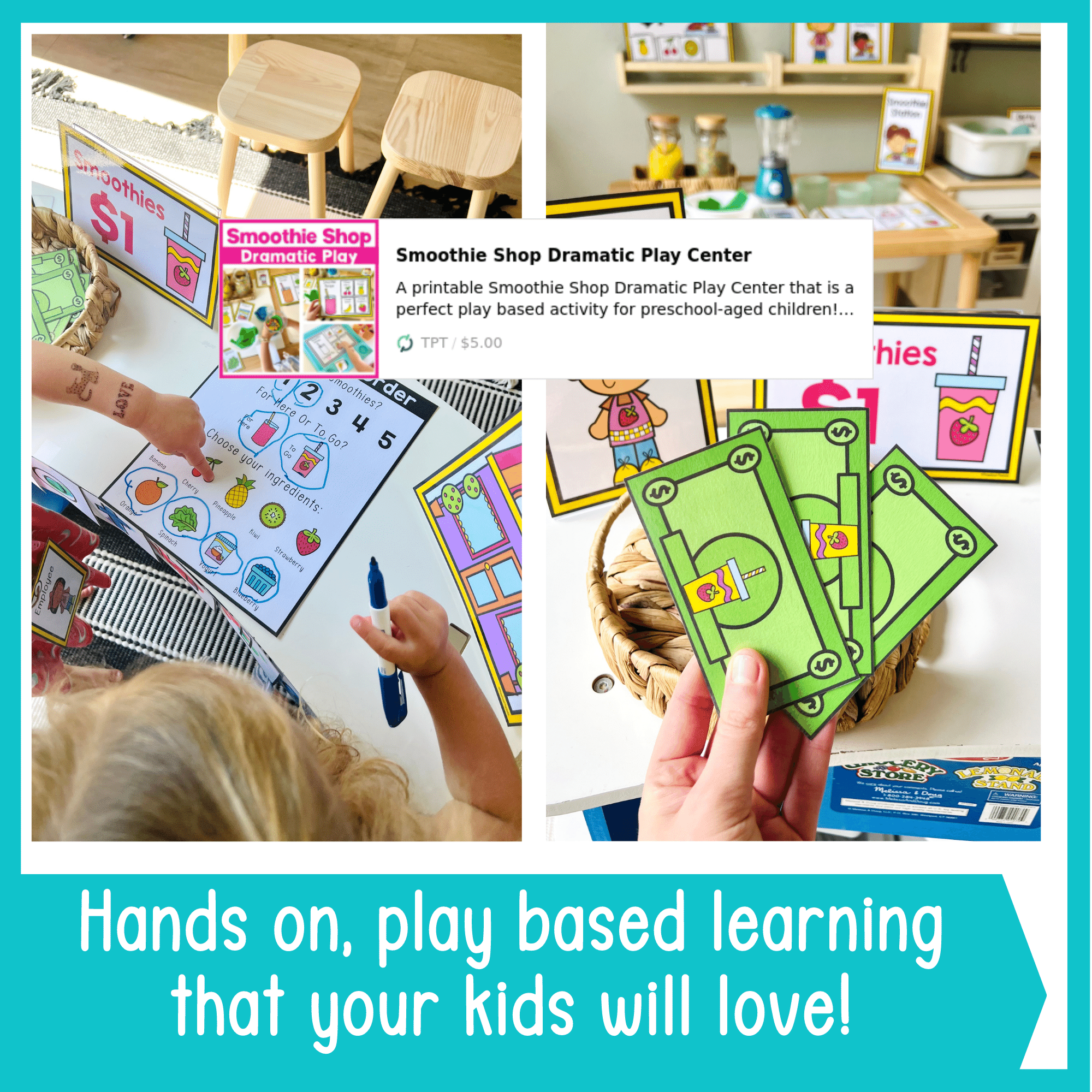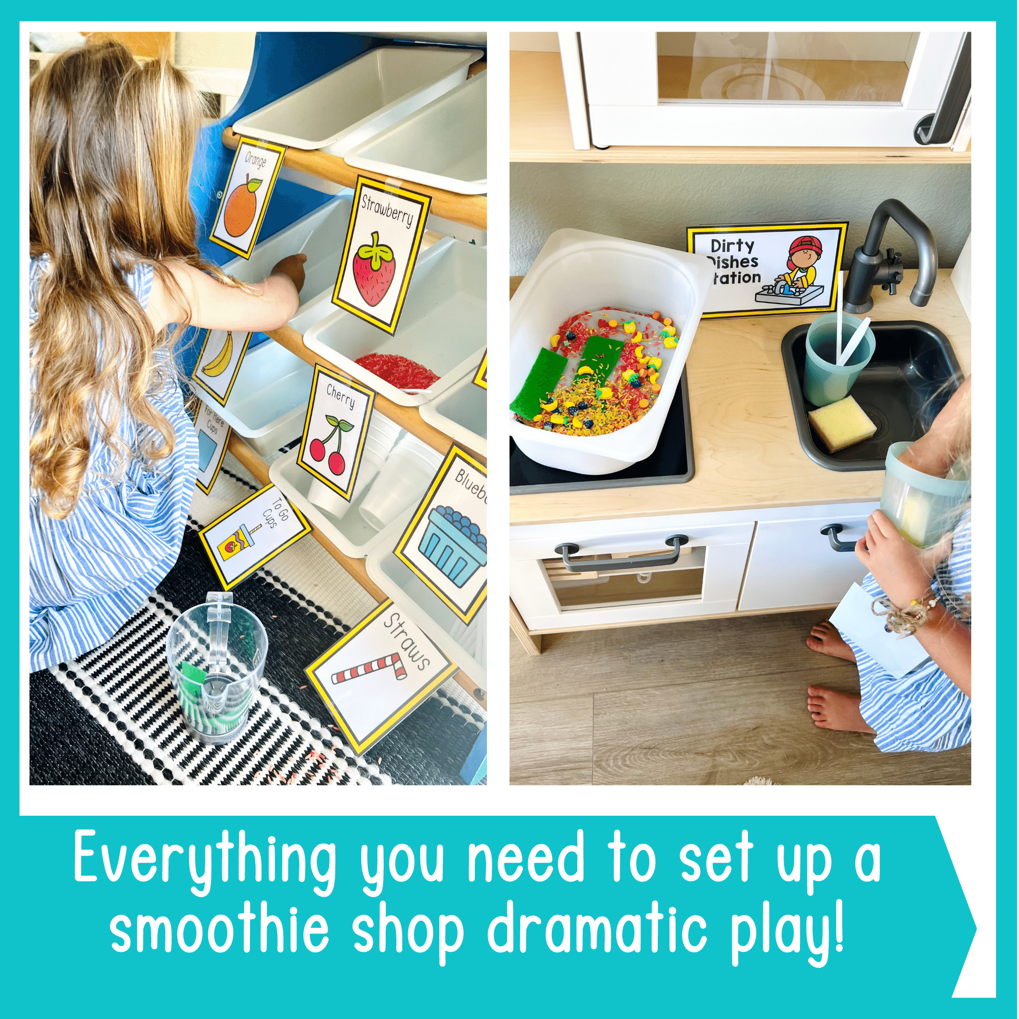 A printable Smoothie Shop Dramatic Play Center that is a perfect play based activity for preschool-aged children! This interactive smoothie shop encourages pretend play, social skills, pouring skills, and basic math concepts like counting money and making change.