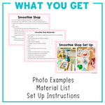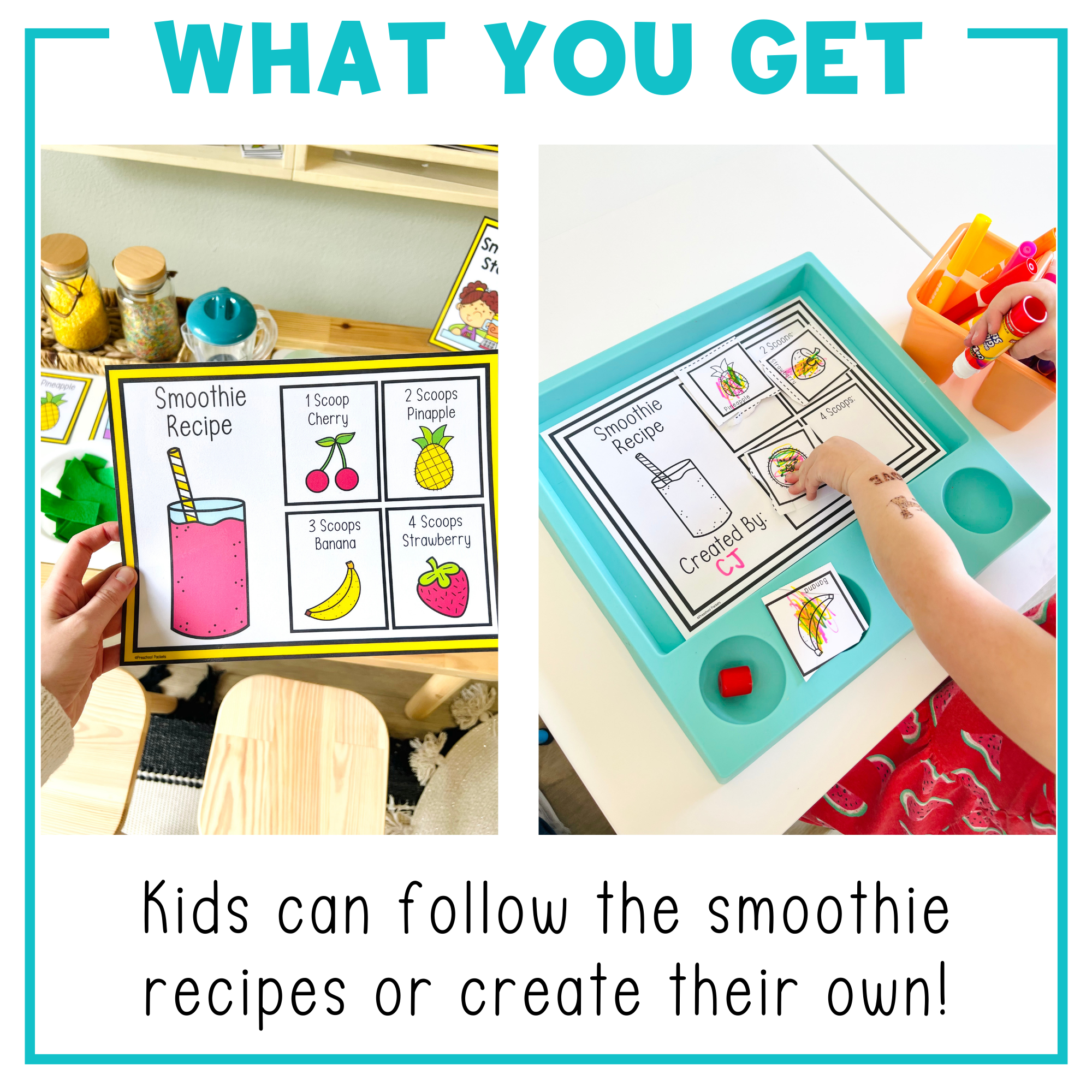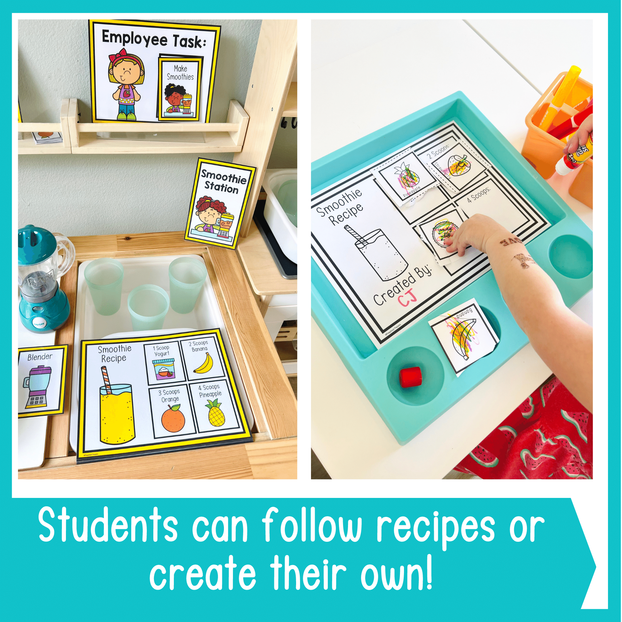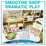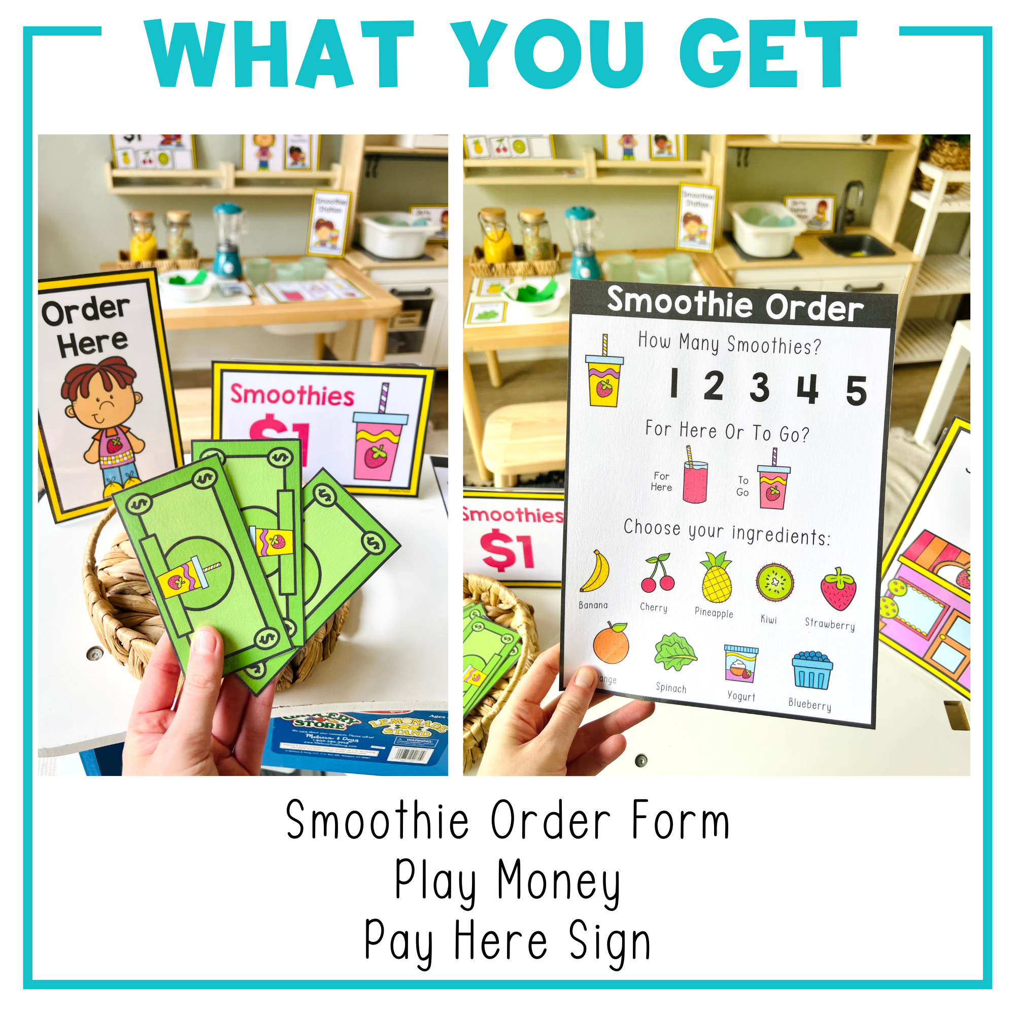 A printable Smoothie Shop Dramatic Play Center that is a perfect play based activity for preschool-aged children! This interactive smoothie shop encourages pretend play, social skills, pouring skills, and basic math concepts like counting money and making change.