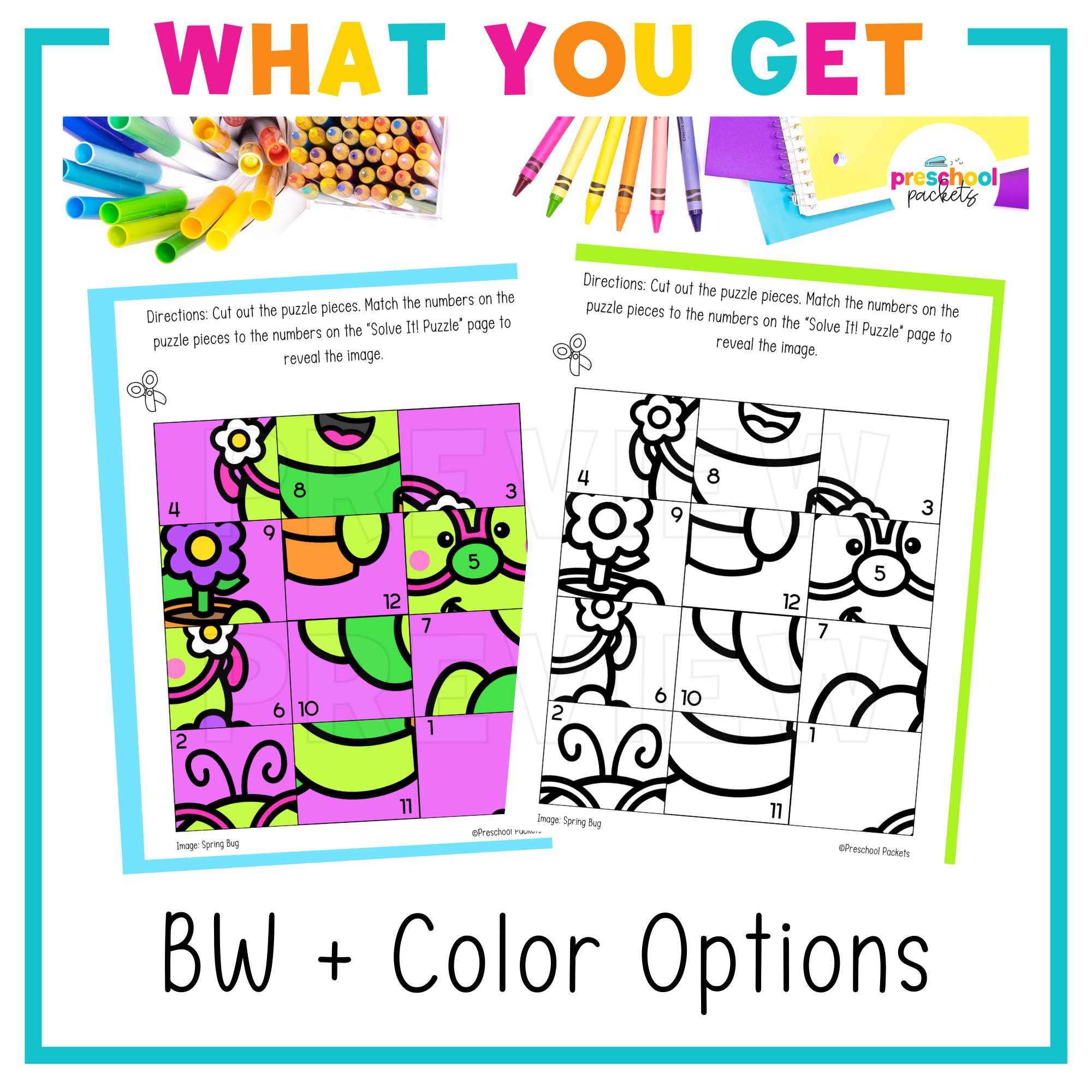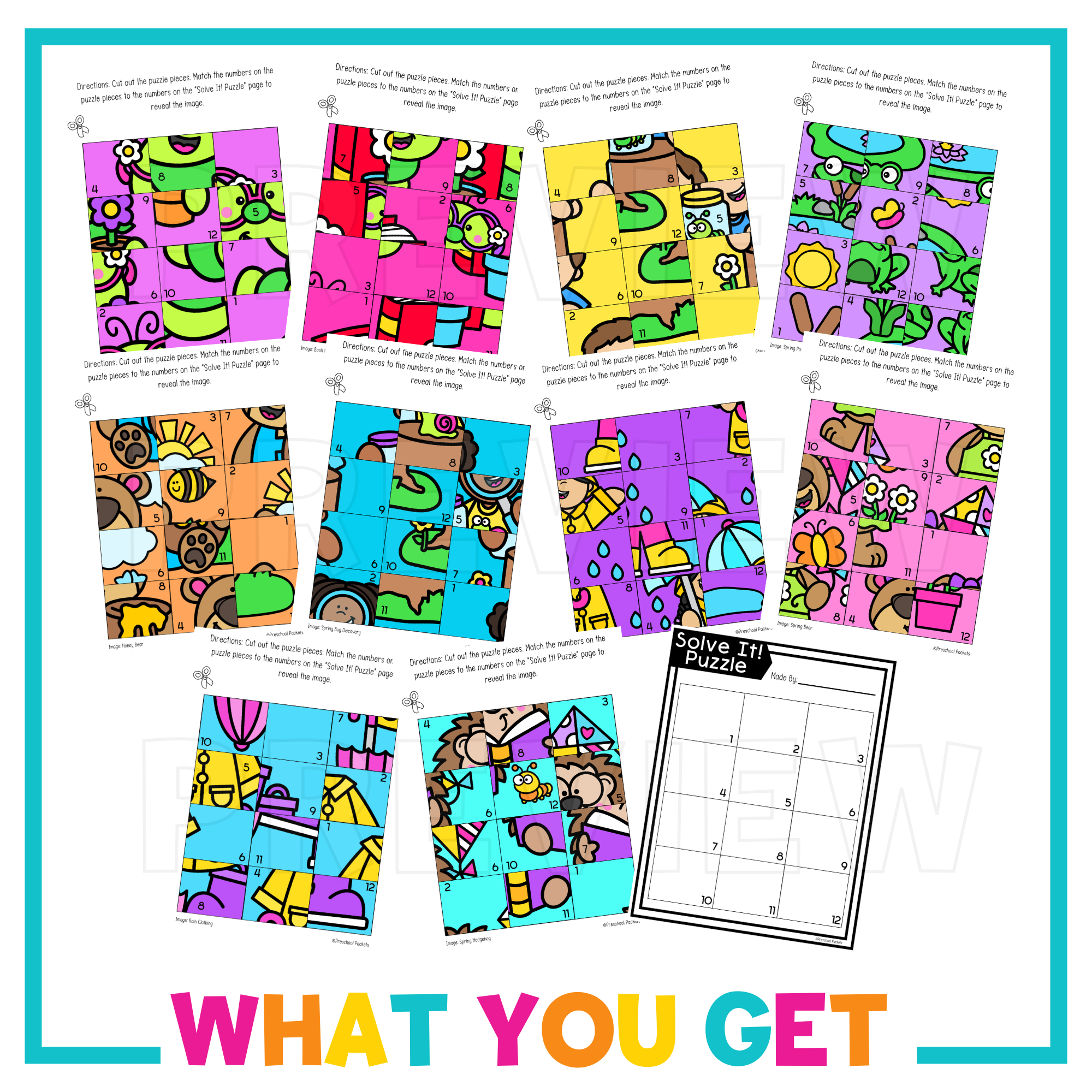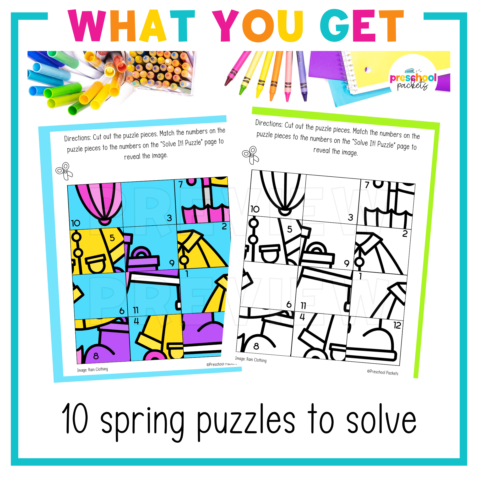 ⭐ 10 Spring Solve It! Puzzles - BW and color options are provided for each puzzle.