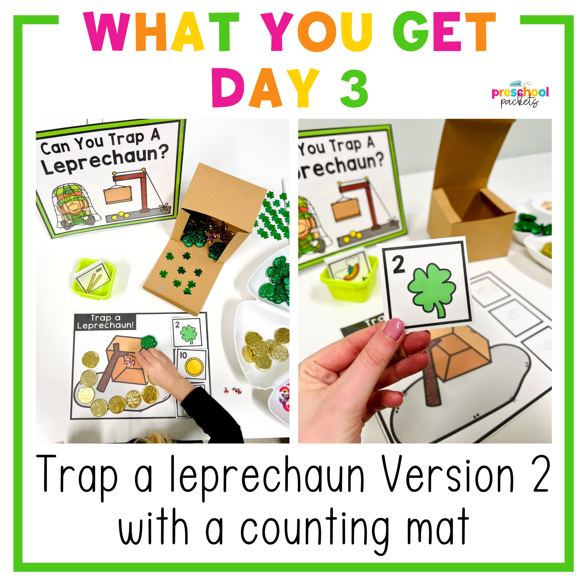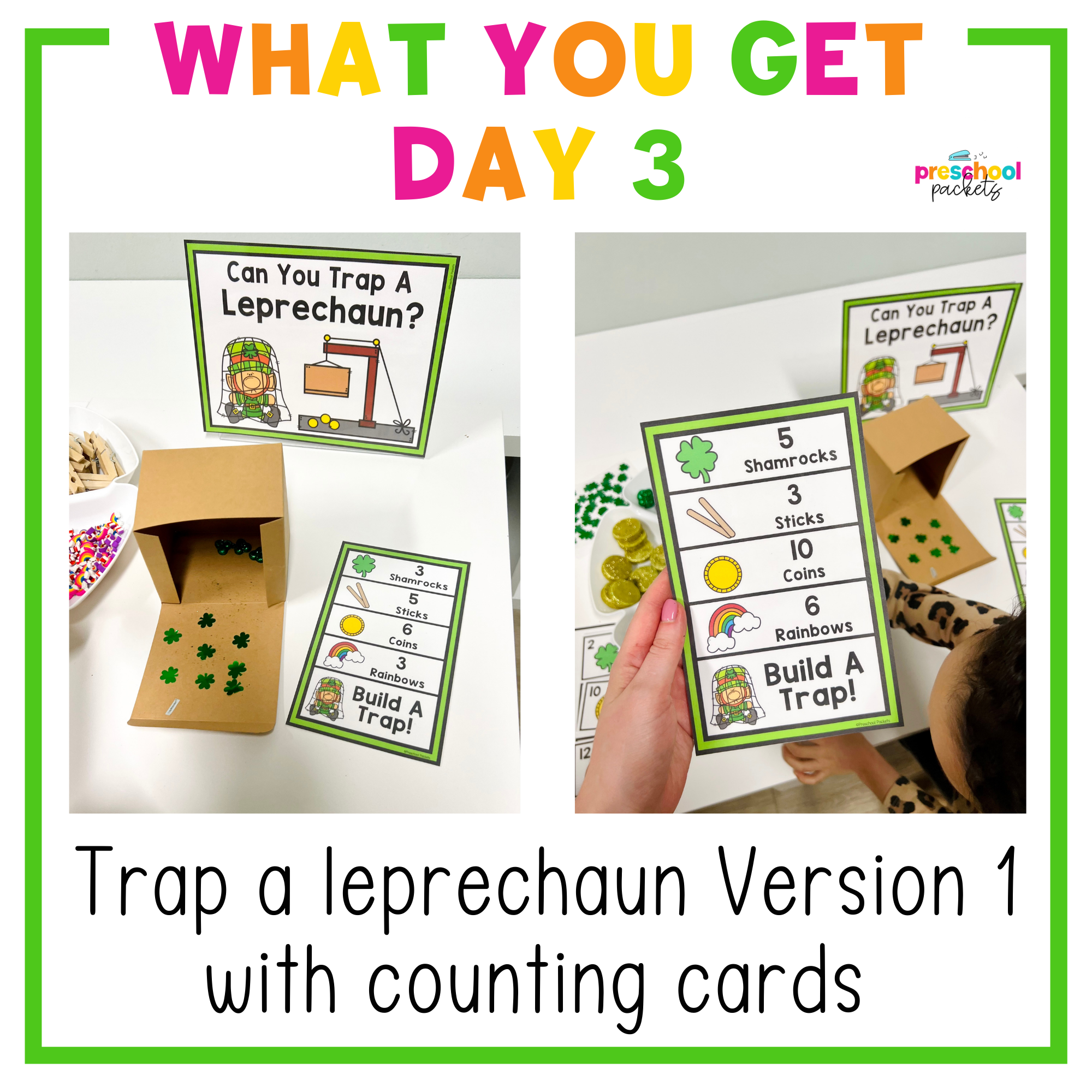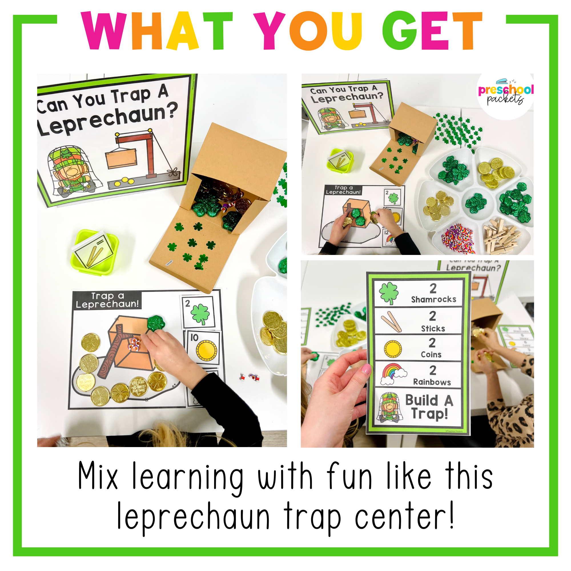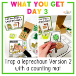 - Leprechaun Trap: Set up a sorting tray with St. Patrick's themed items for students to build their own leprechaun trap. Two versions have been provided. Cards only for you to use your own supplies to build a leprechaun trap or use the the leprechaun trap mat with counting cards.