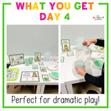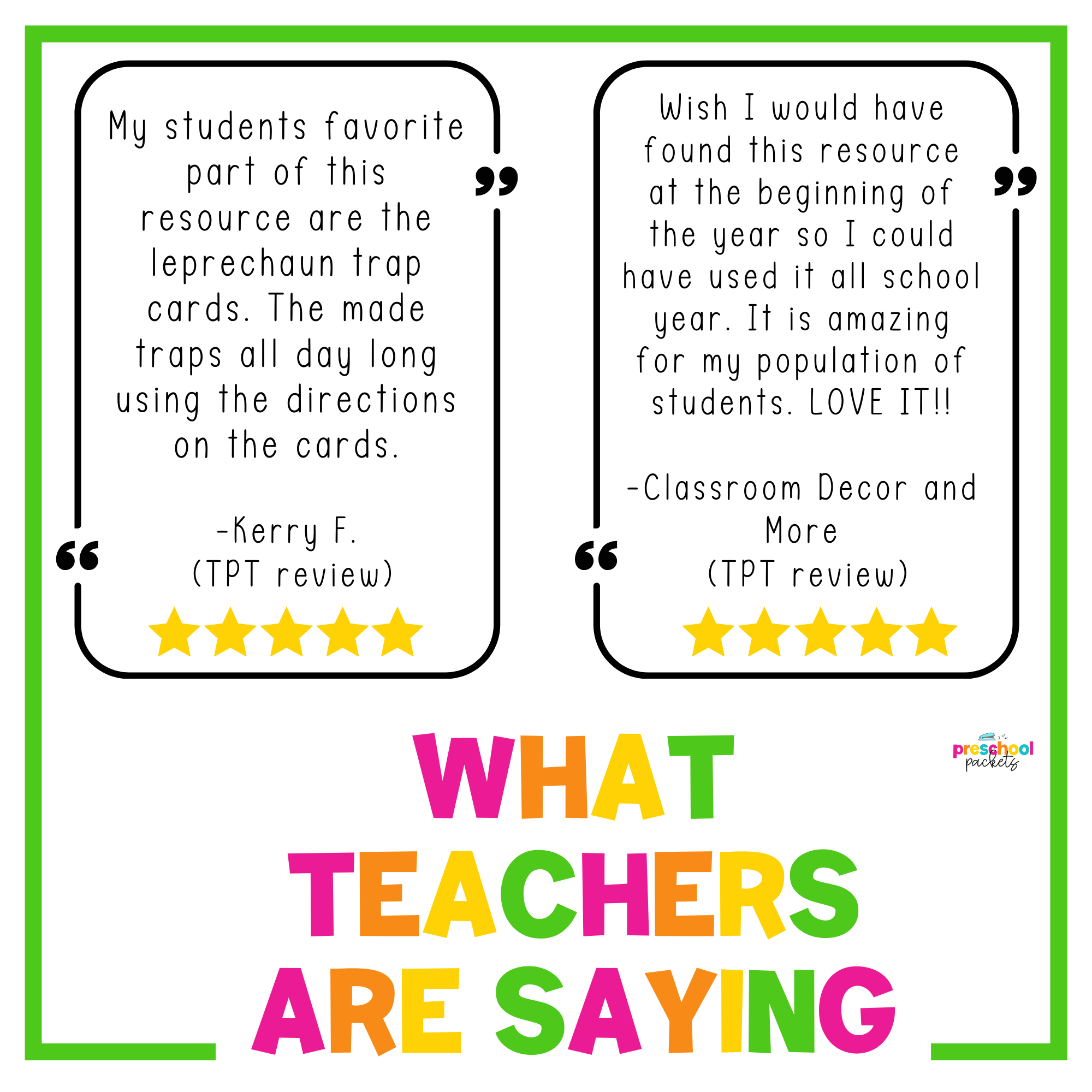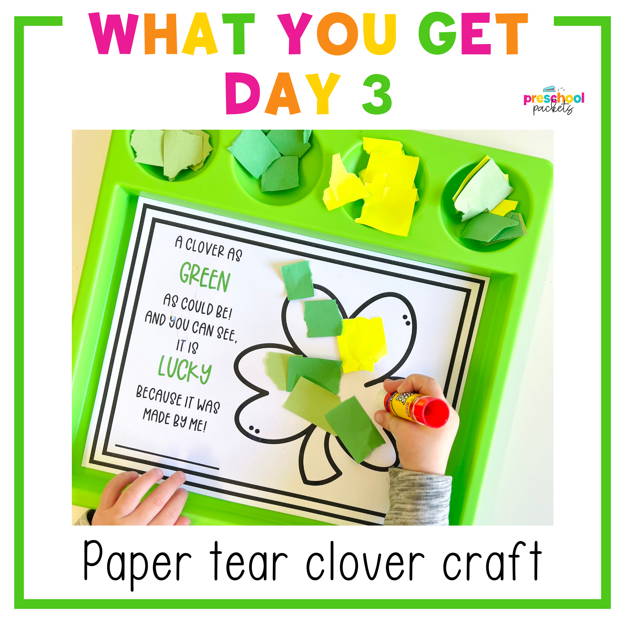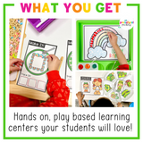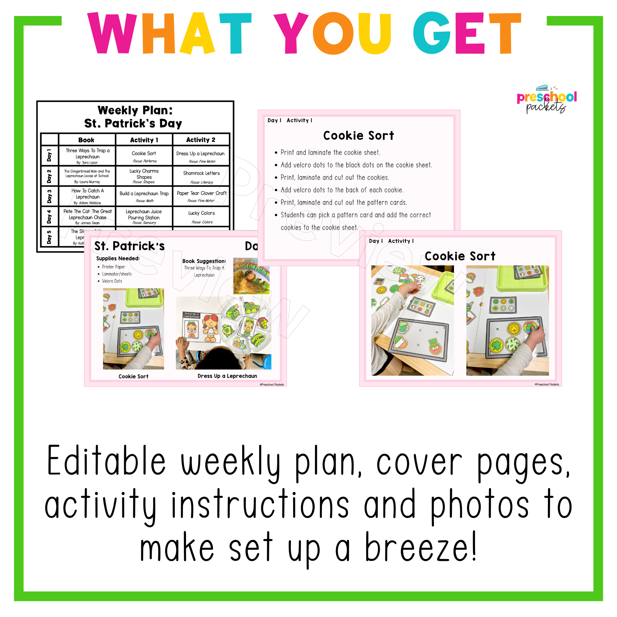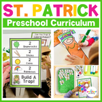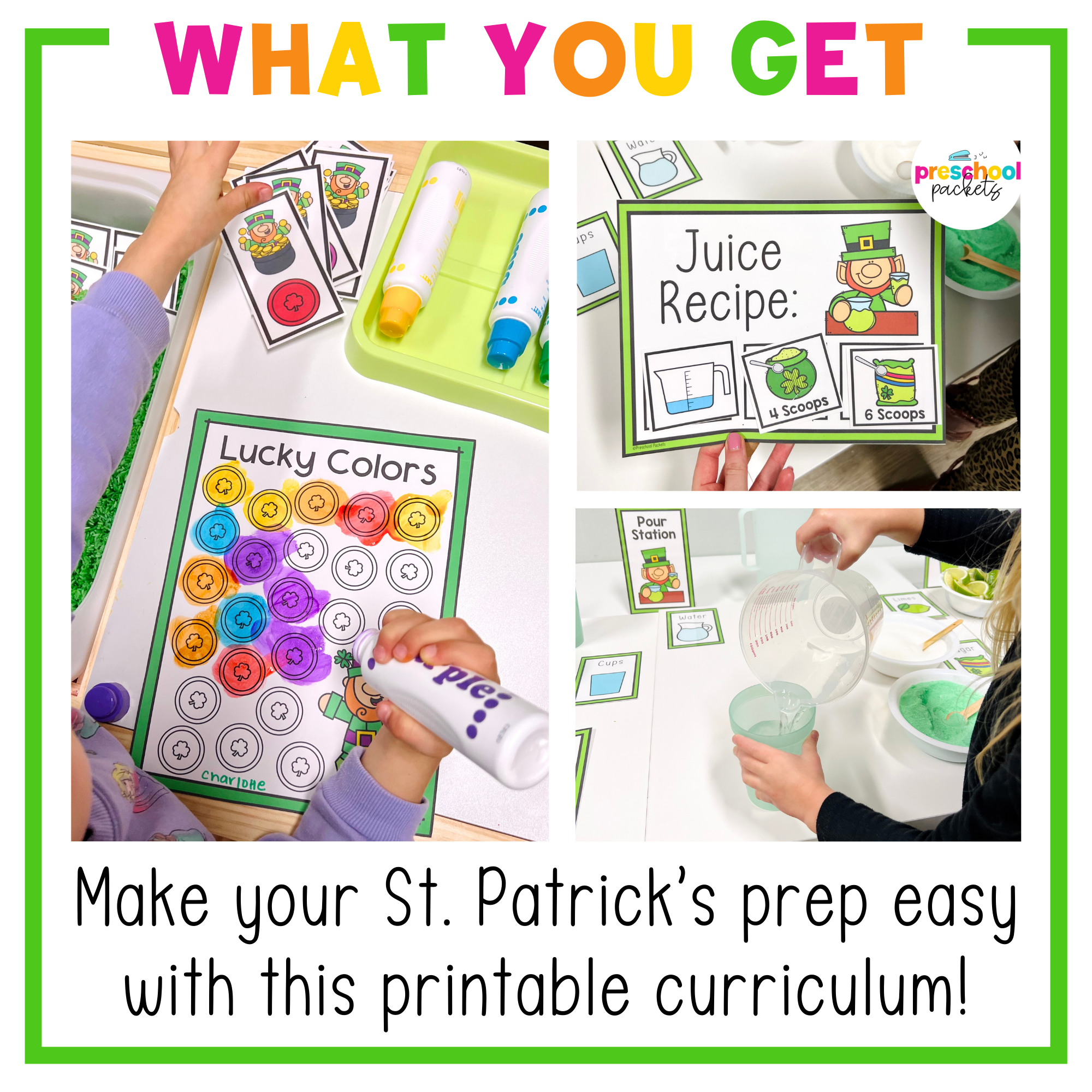 St. Patrick's Day themed printable curriculum for your preschool classroom! This St. Patrick's Day pack spans 5 days of engaging and hands-on activities that your kids will LOVE. This set is filled with a leprechaun trap math center, St. Patrick's themed sensory bins, shamrock crafts, fine motor centers, literacy activities and so much more!
