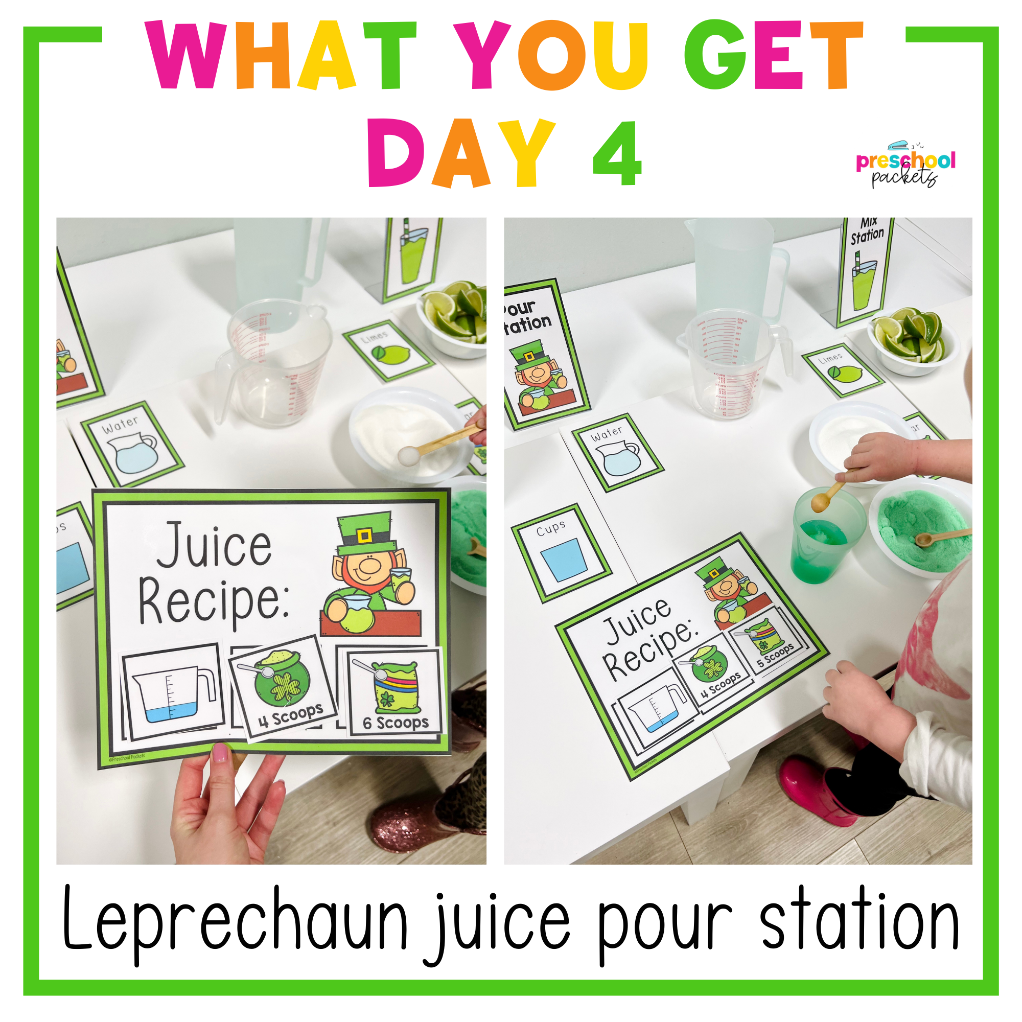 - Leprechaun Juice: Set up a pouring station for your students to create leprechaun juice (aka lemonade). Students create their own leprechaun recipe by scooping and pouring the correct amount of each item into their cup. If you prefer a less messy option, this is great for a dramatic play set up!