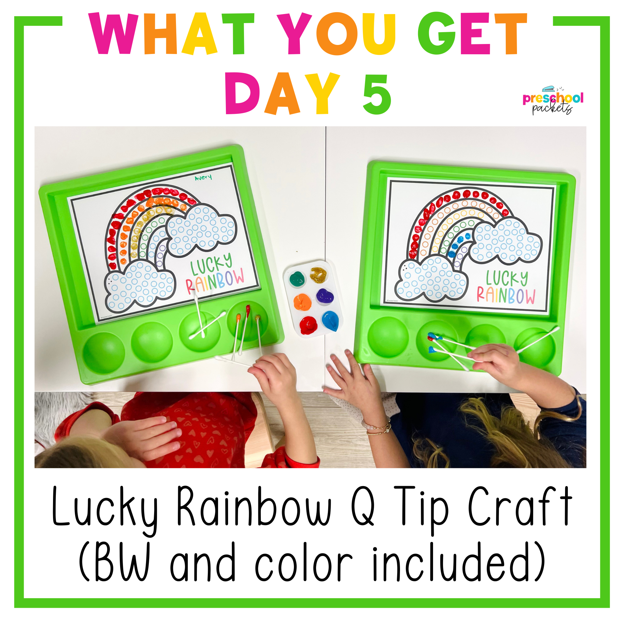 - Lucky Colors Q Tip Craft: Students use q tips to fill the rainbow will colors. BW and color options have been provided.