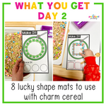 - Lucky Shape Cards: Set up a sensory bin filled with charm cereal. Students can scoop the charm marshmallows to create each shape on the mat and trace the shapes. 8 Shapes included: circle (shamrocks) , square (rainbows), hearts (hearts), triangle (horseshoes), star (shooting stars), crescents (moons), rectangle (unicorns) oval (balloons)