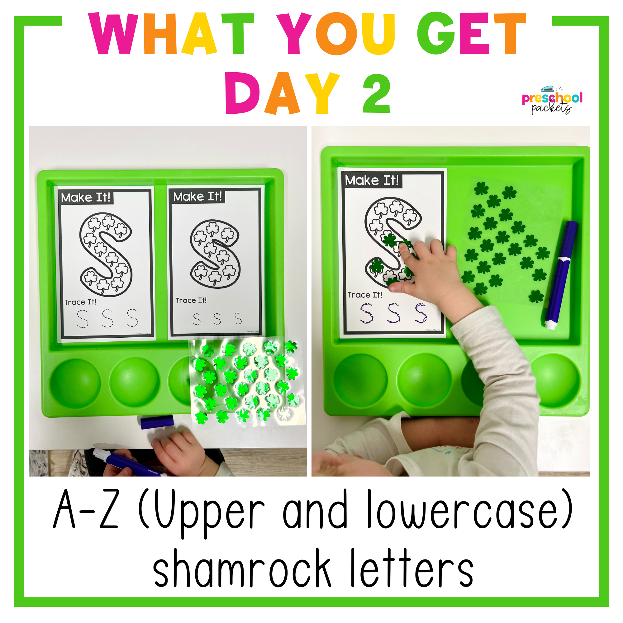 - Shamrock Letters: A-Z uppercase and lowercase clover letters inclued. Students can use shamrock stickers or dot markers to create each letter and trace the letter on the sheet.