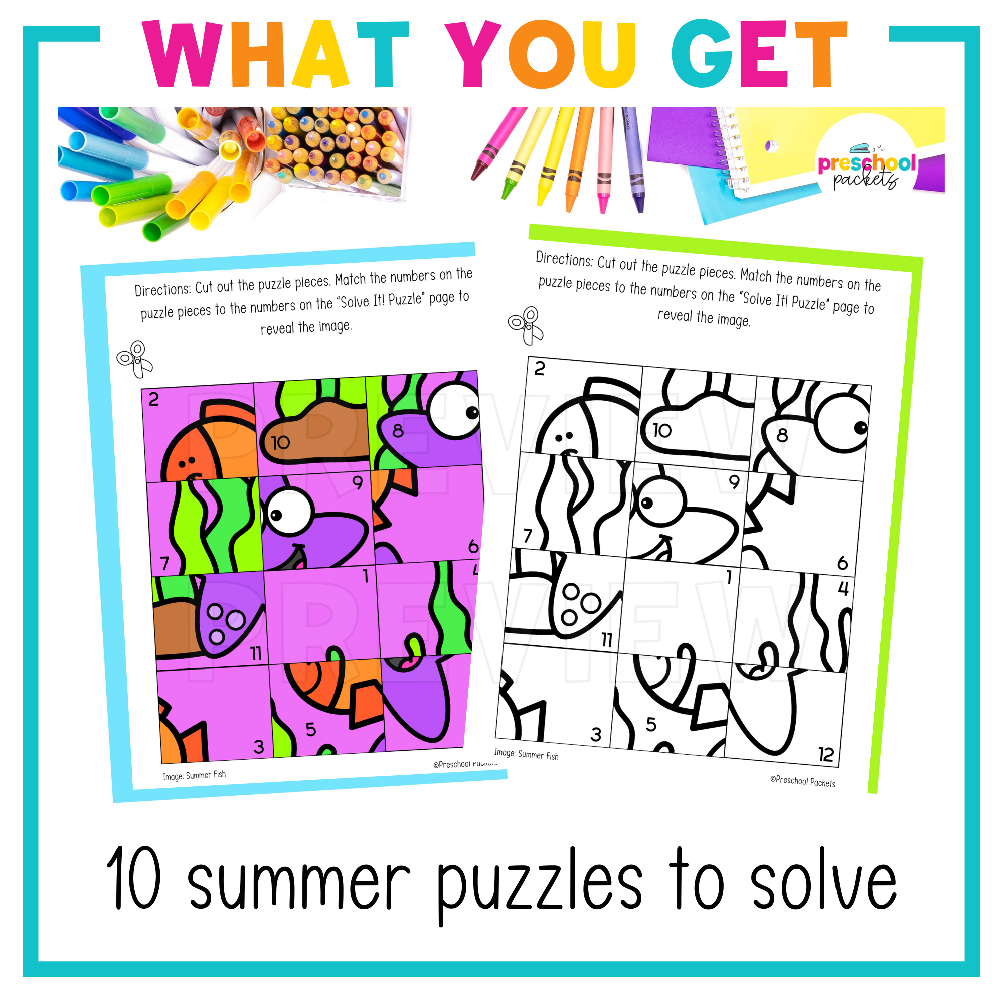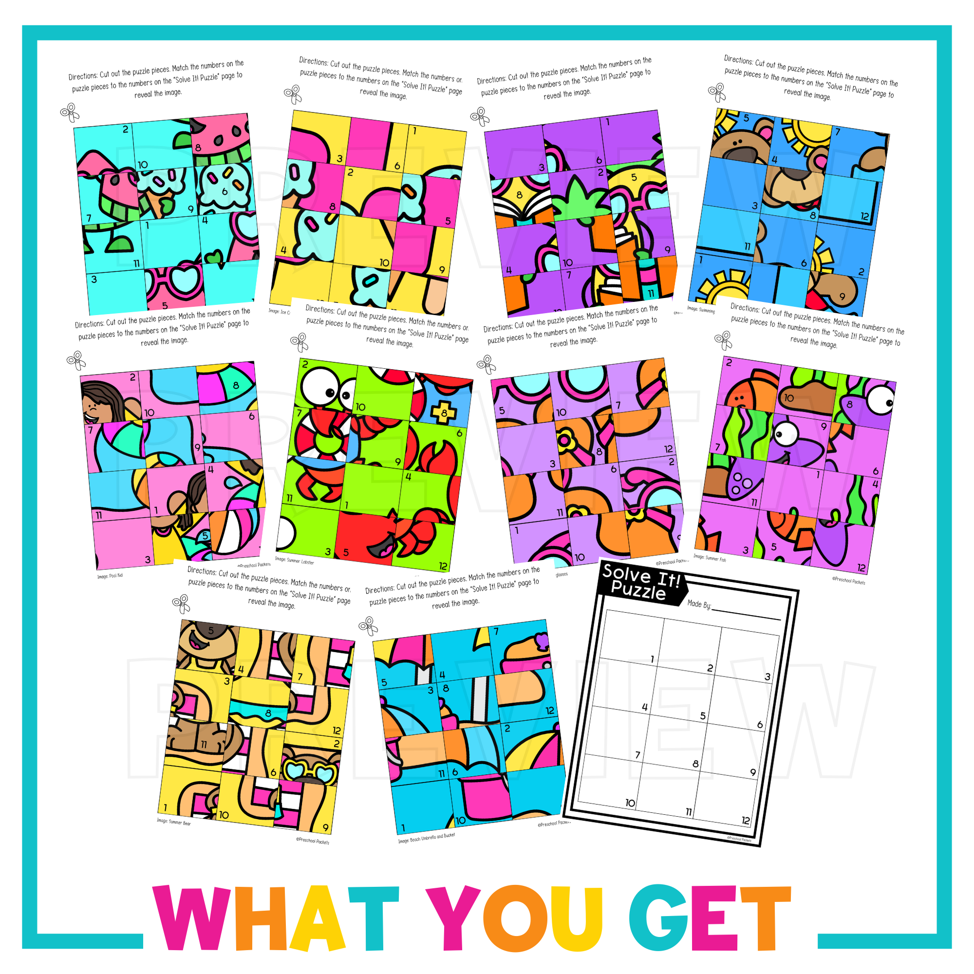 ⭐ 10 Summer Solve It! Puzzles - BW and color options are provided for each puzzle.
