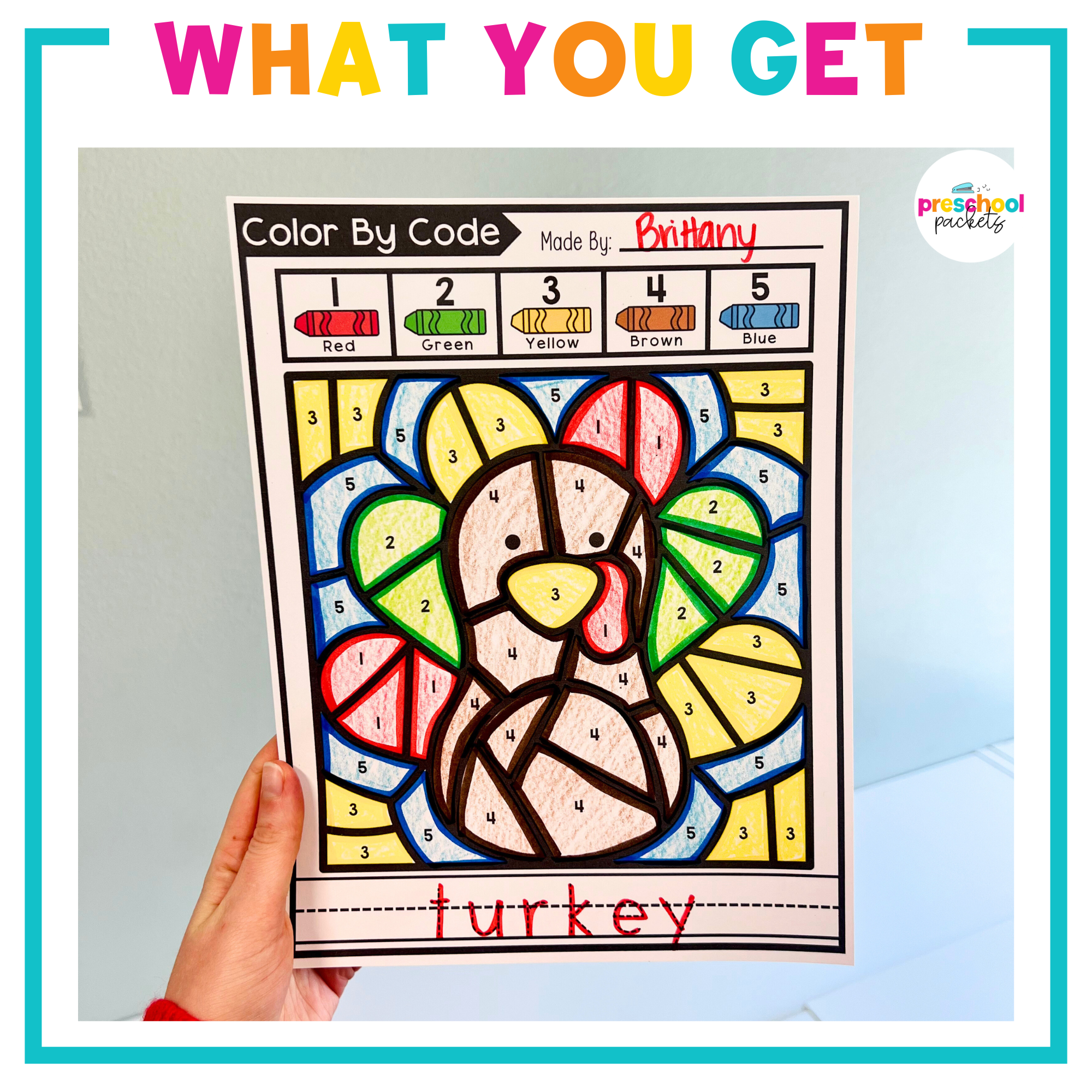 Thanksgiving Color By Code - a no prep activity that is perfect for holiday season! These color by code sheets are perfect for letter of the morning tubs, independent activities and math lessons for your preschool, preK and Kindergarten classrooms!