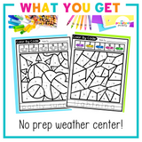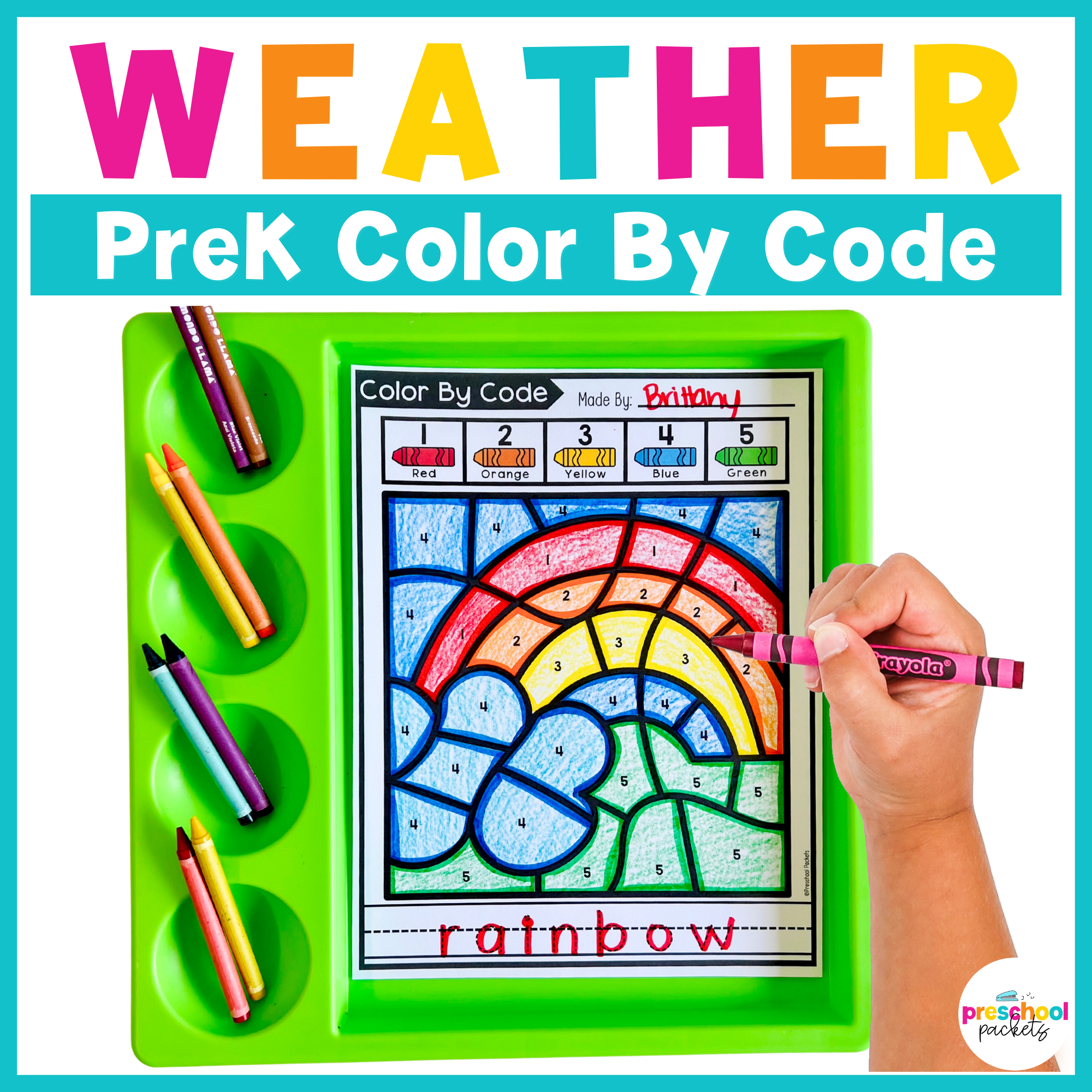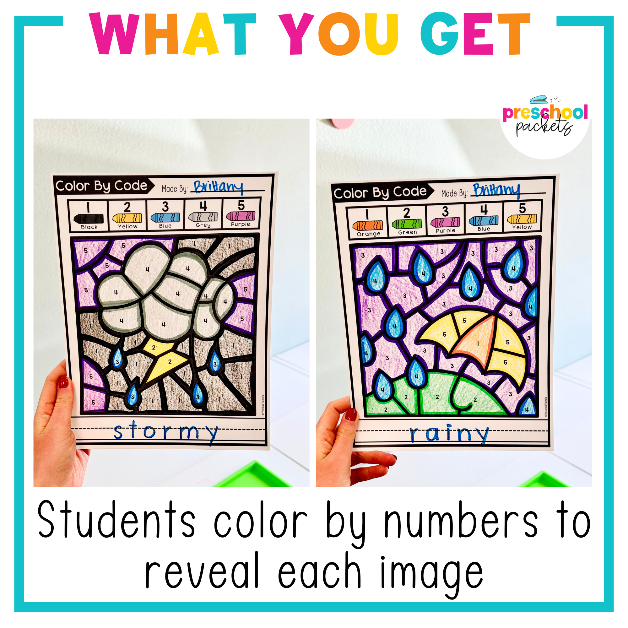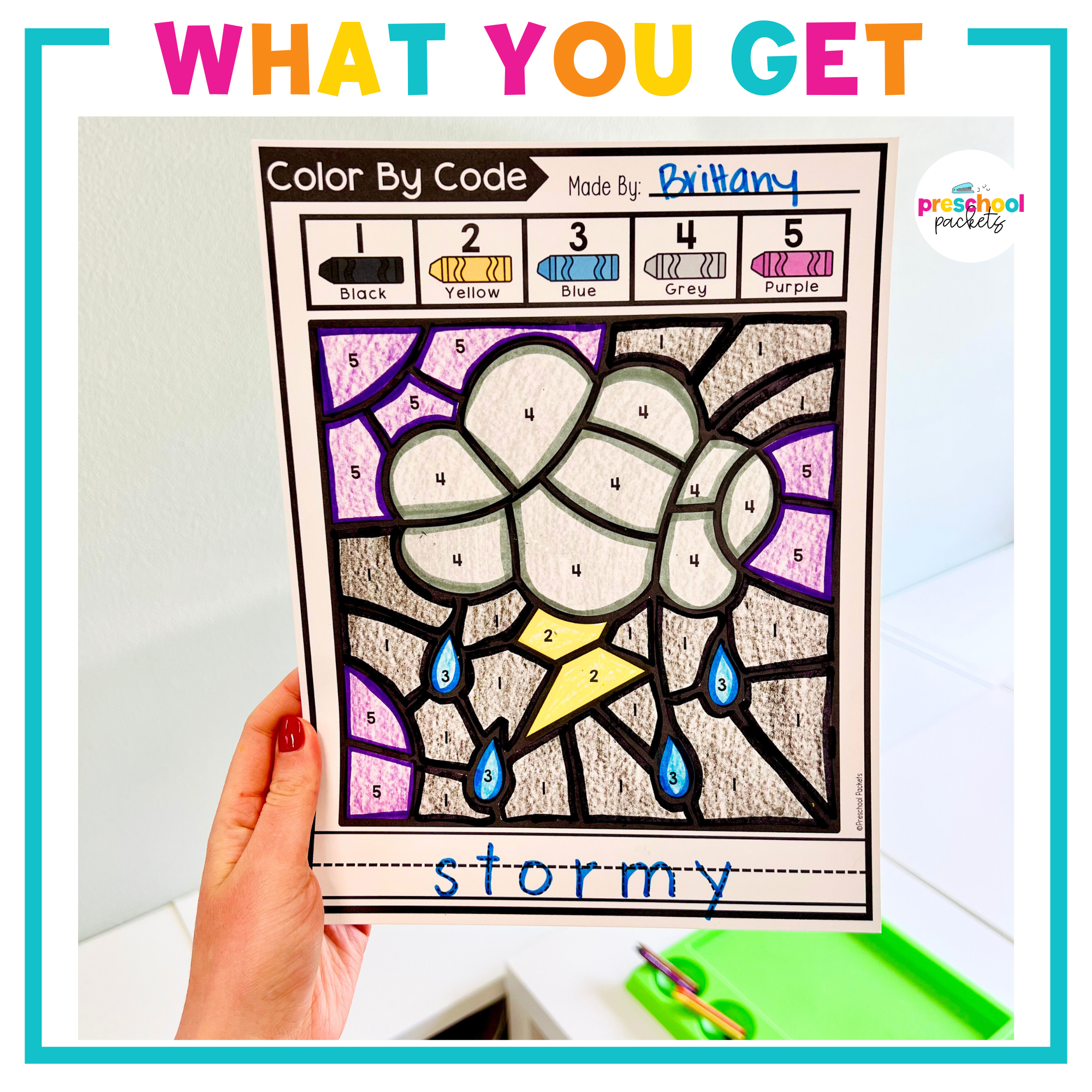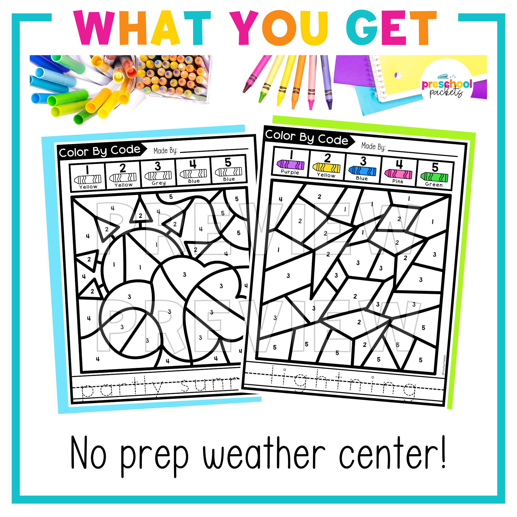 Weather Color By Code - a no prep activity to add to your preschool weather lesson plans! These color by code sheets are perfect for letter of the morning tubs, independent activities and math lessons for your preschool, preK and Kindergarten classrooms!