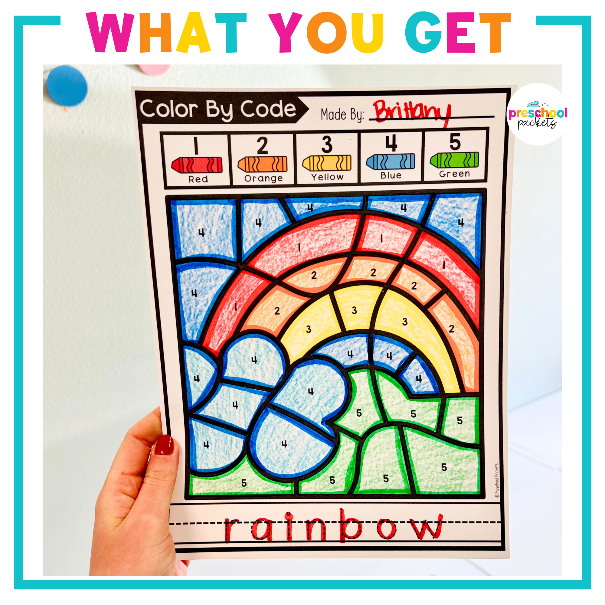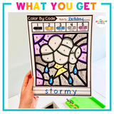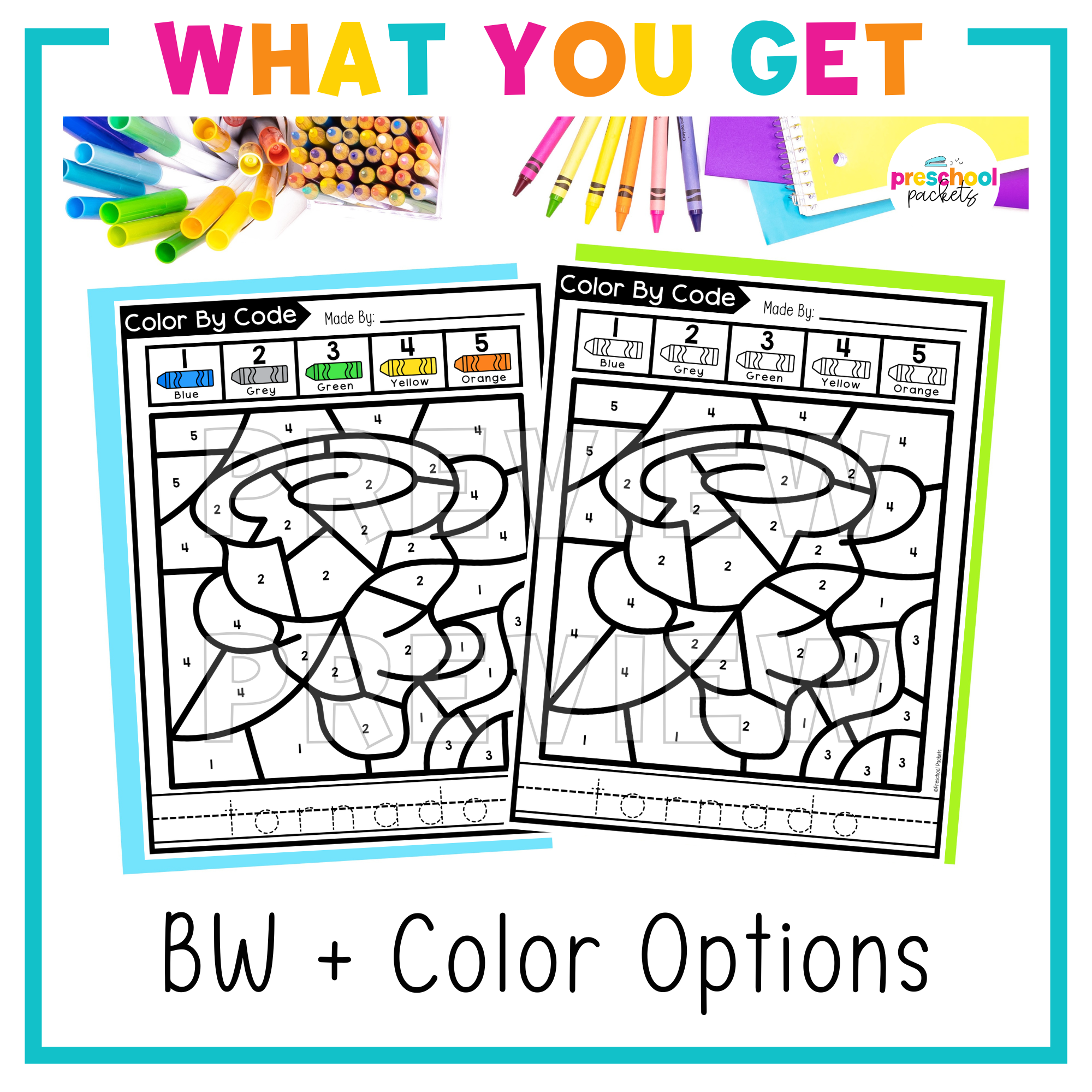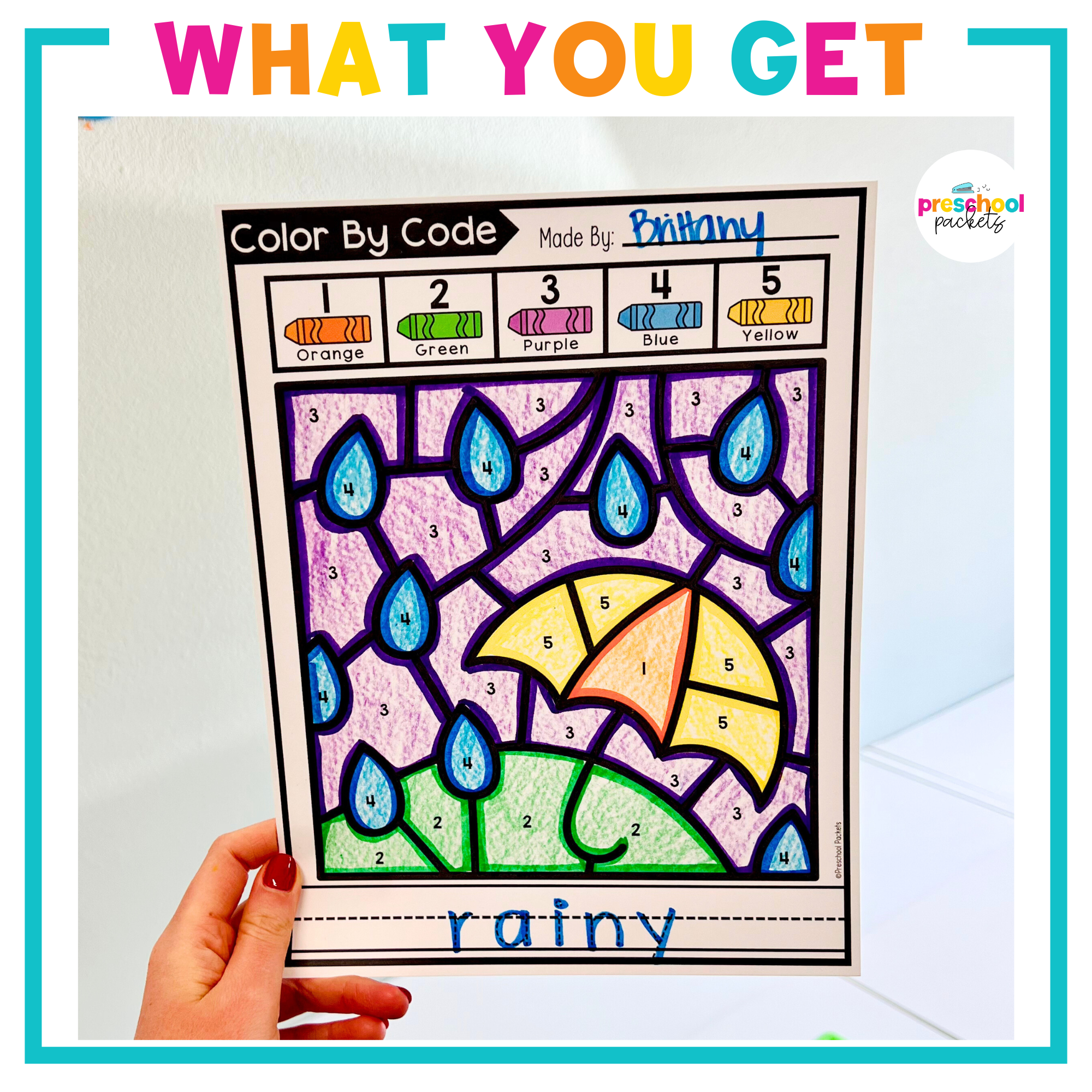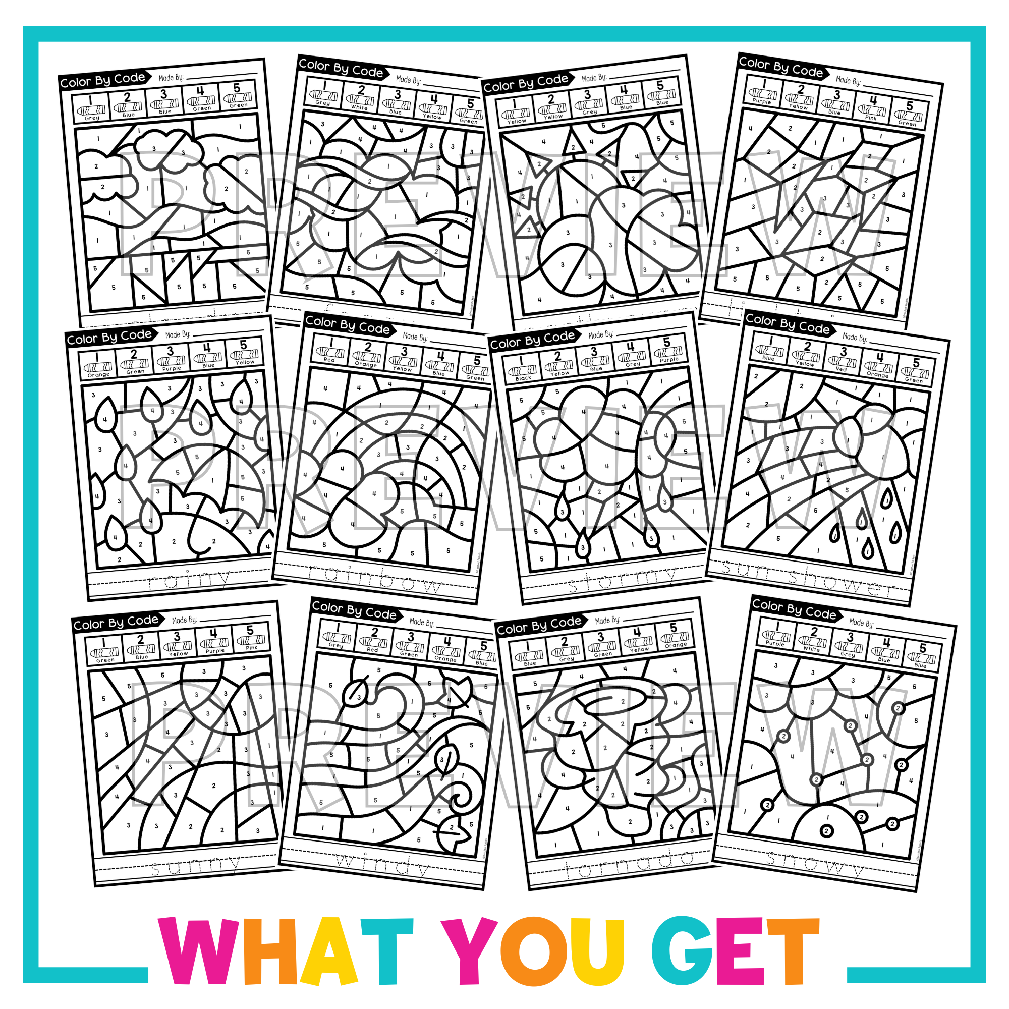 Weather Color By Code - a no prep activity to add to your preschool weather lesson plans! These color by code sheets are perfect for letter of the morning tubs, independent activities and math lessons for your preschool, preK and Kindergarten classrooms!