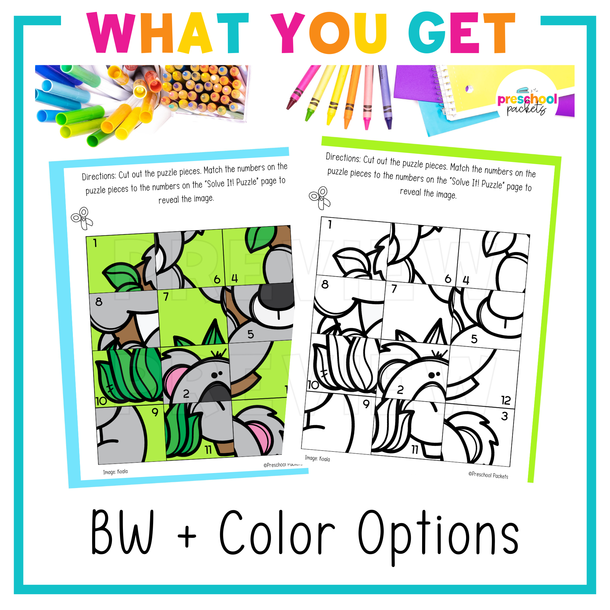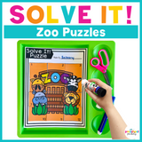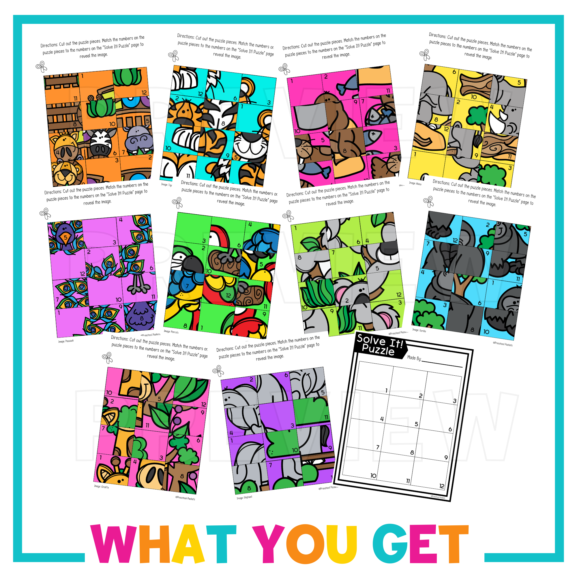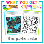 ⭐ 10 Zoo Solve It! Puzzles - BW and color options are provided for each puzzle.