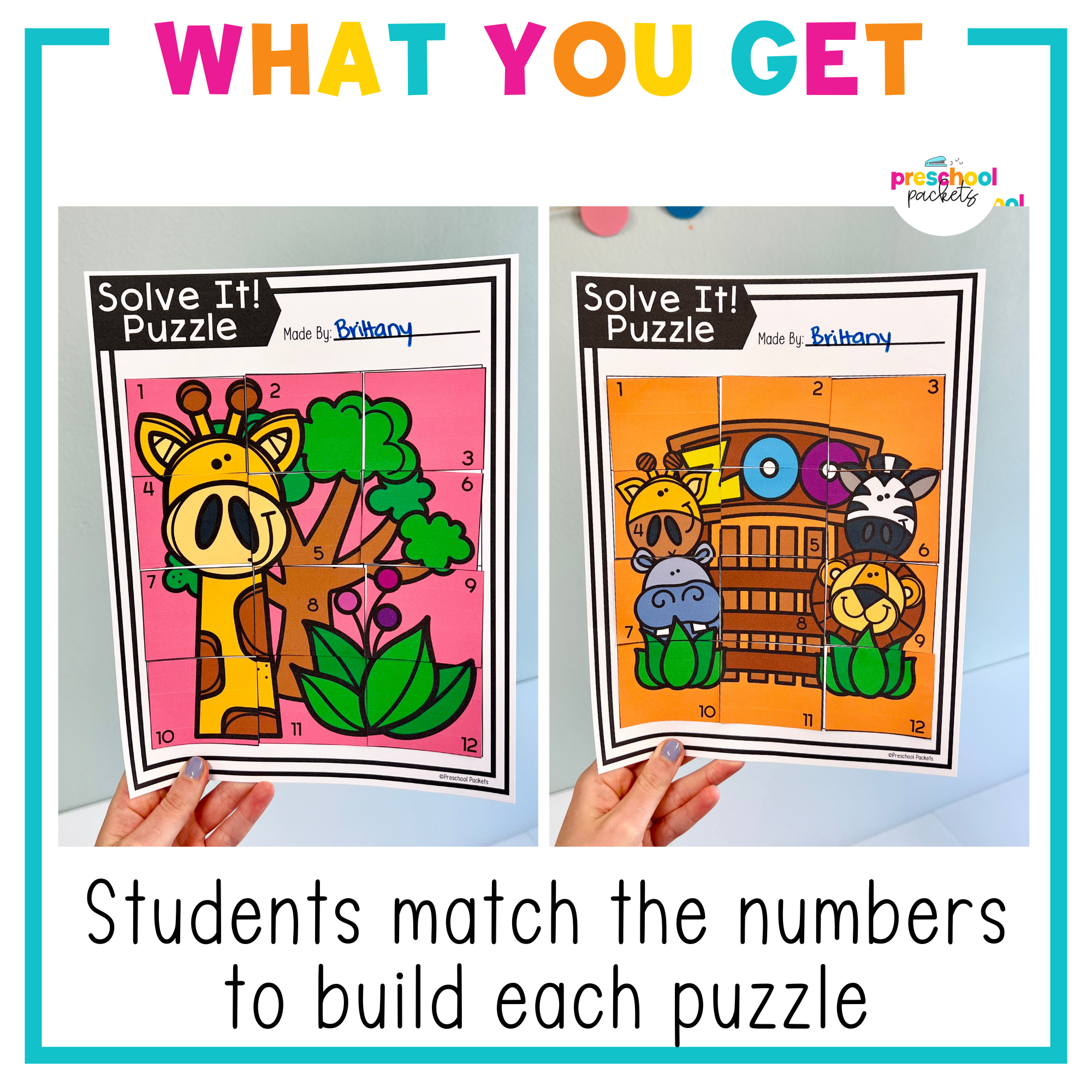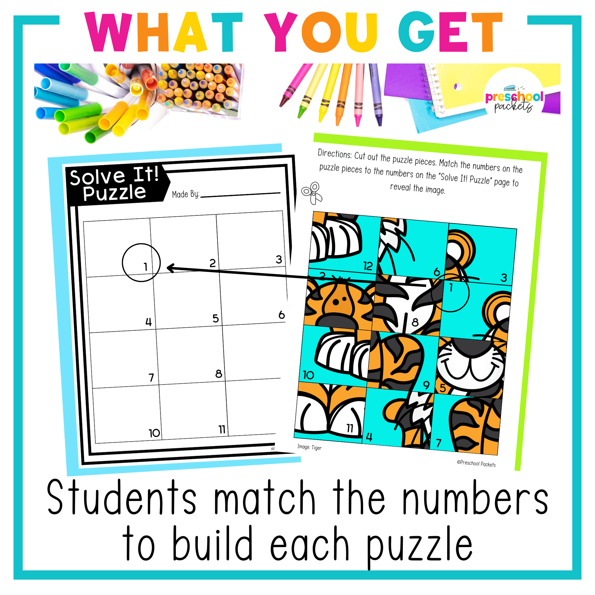 Students can work on fine motor skills by cutting and pasting each puzzle piece, or you can laminate them for repeated use! Plus work on math skills by matching each number to build the puzzle.